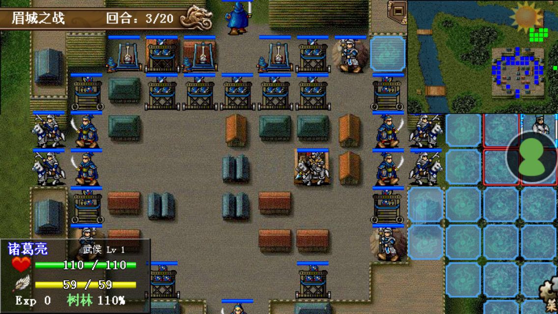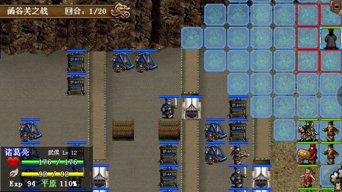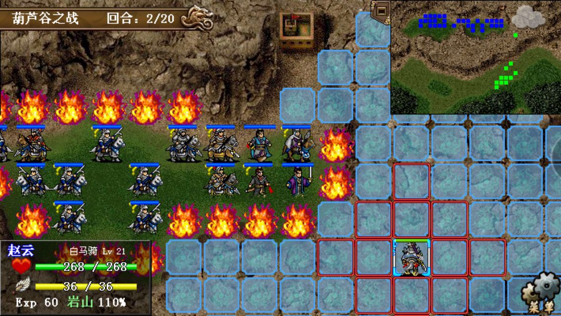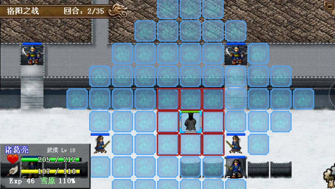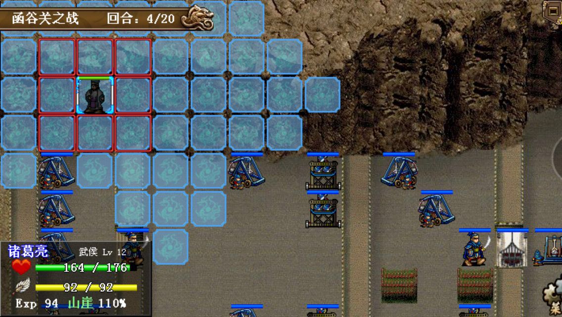 第一回合:诸葛亮左移四格进入山崖,其他人给赵云加攻加防吃个圣经验果,基本在原地待命
