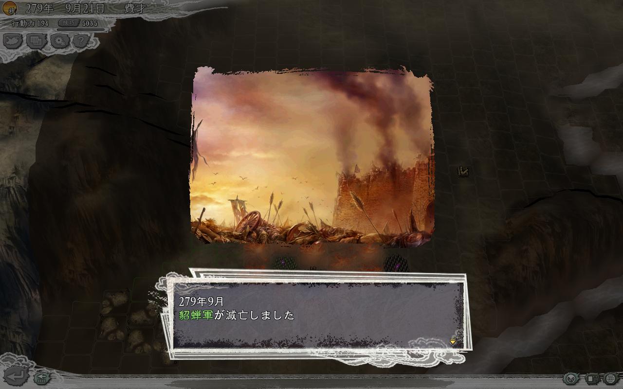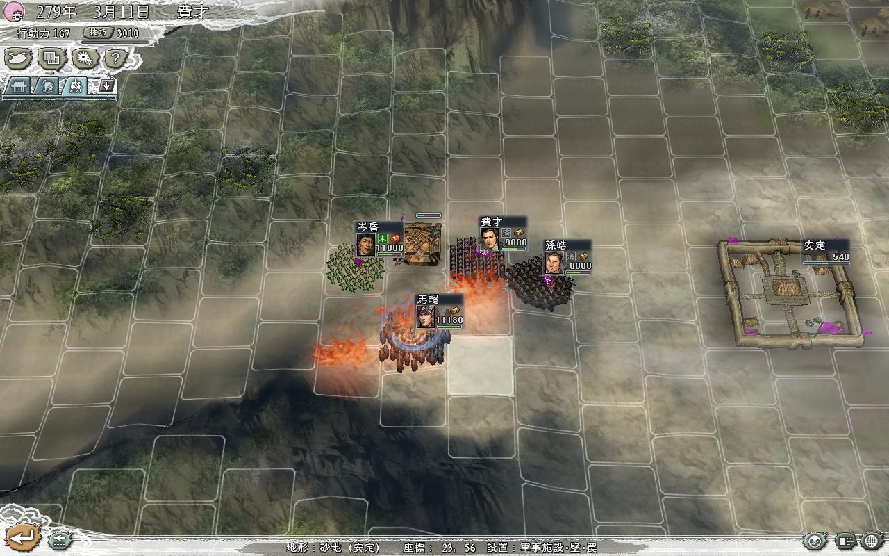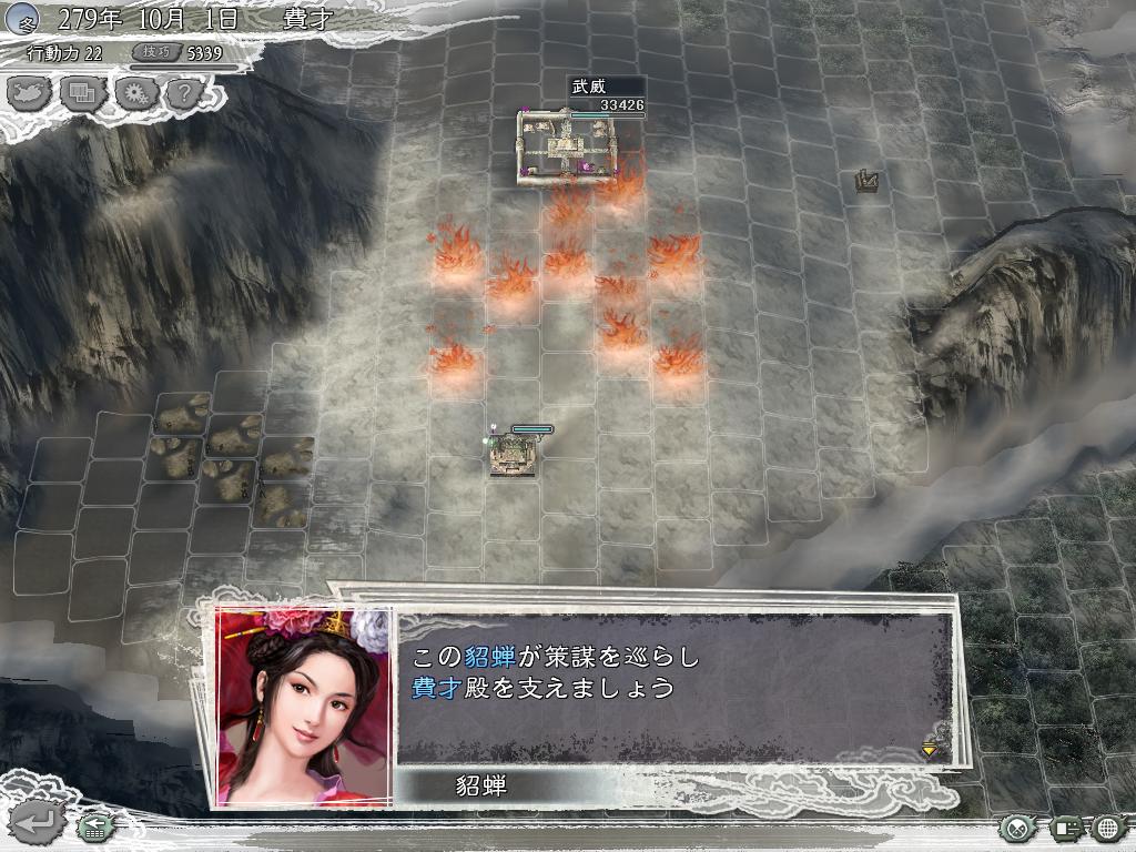 灭了貂蝉,天下遂成二分,我即将全军皆安顿于安定准备战略物资,准备下一年全力进攻蔡琰。军中又招聘了废柴张绍和赵范,我通过寻找柴桑附近的庙和遗迹,陆续给没有特技的废才和MM们学习技能。分别是:韩玄骑兵适性S、全尚捕缚、刘度百出、张绍疾走、赵范明镜、貂禅神算、蔡氏射程、花鬘扫讨等。