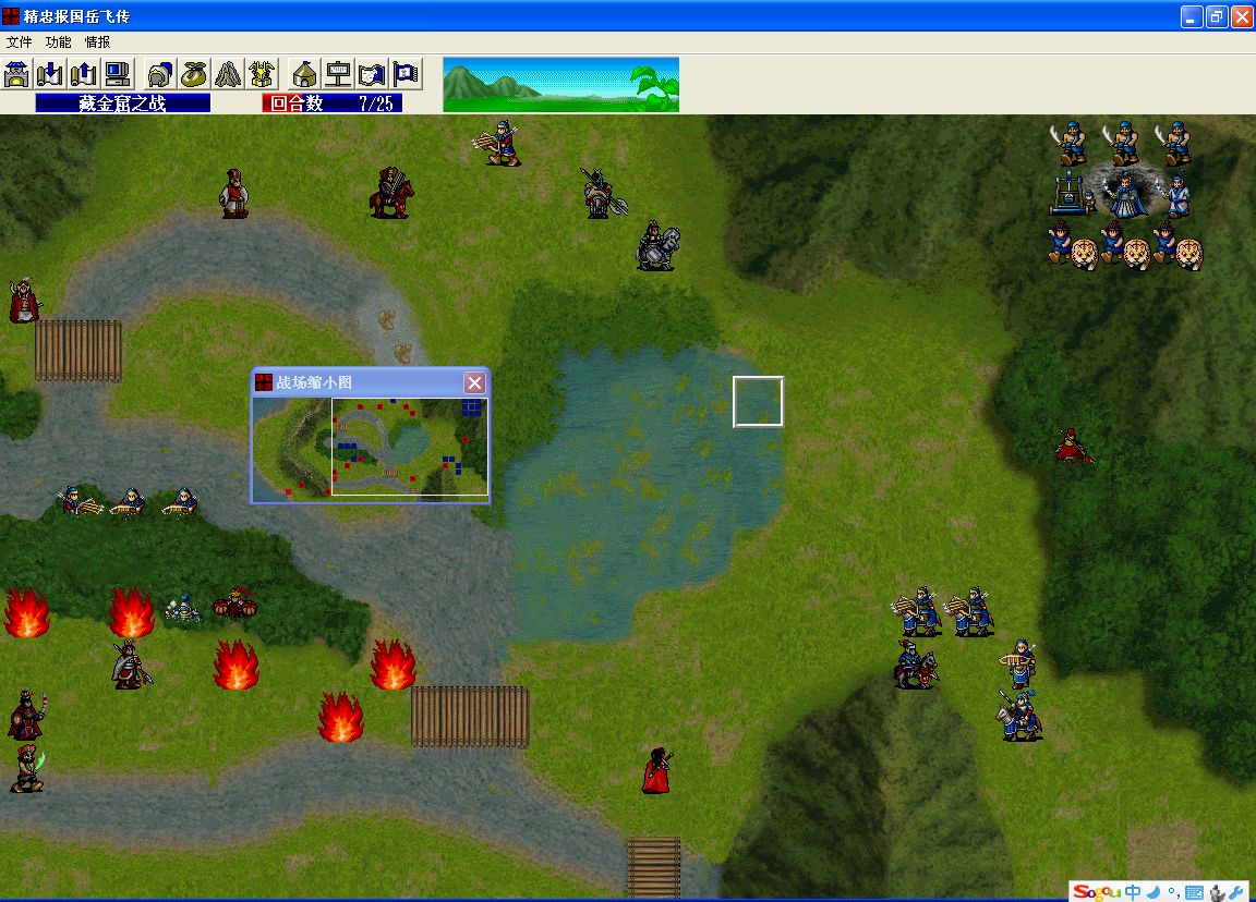 2.第二回合要把左上营1步兵和两弓兵杀了并触发岳飞特技。第三回合岳飞到山顶吸引敌人来打。左右两拨要各有一人到下面帮忙杀弓骑兵。