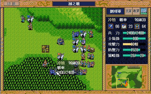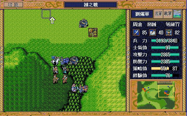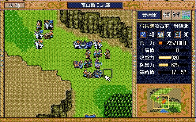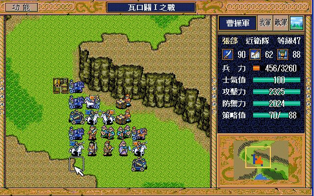 到23回合,张郃兵力见底,马良亦达到44级,所以停止打张郃,刘辟移到马良的位置继续烧,用光了身上的焦热书,刘封等人依次到刘辟腾出的位置给张郃打,供瓦口关II开始时激励、援助。27回合,46级吴兰吃掉丁四右边41级骑兵,利用村中骑兵先动腾出村庄供张郃恢复,这点实现起来比较困难,原因是张郃攻击力高,总是打人不肯进村庄恢复,最后用赵云顶在他前面并将其士气降到45才进村(士气再低也不行,降到40以下他就原地激励了),而且29回合士气补足后就重新出来打人了,只给刘辟增加了3次反击机会。