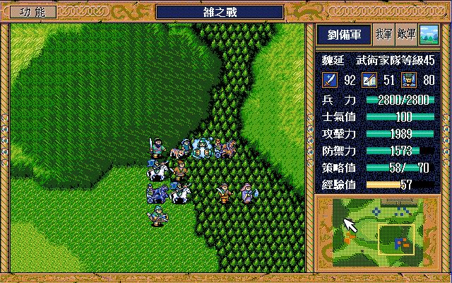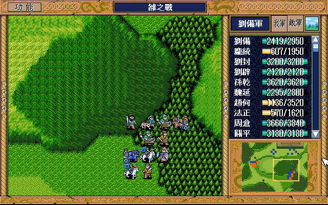 第14回合,魏延烧花五后,47级吴兰吃43级韩浩,耗干了的38级步兵向上撤退,刘备正好将上面的3个敌兵引了过来,两步兵援助基本帮他补足。耗干了的武术家准备让刘辟反击掉,但14回合没反击,15回合武术家撤退回鹿砦恢复了,也是不错的结果。