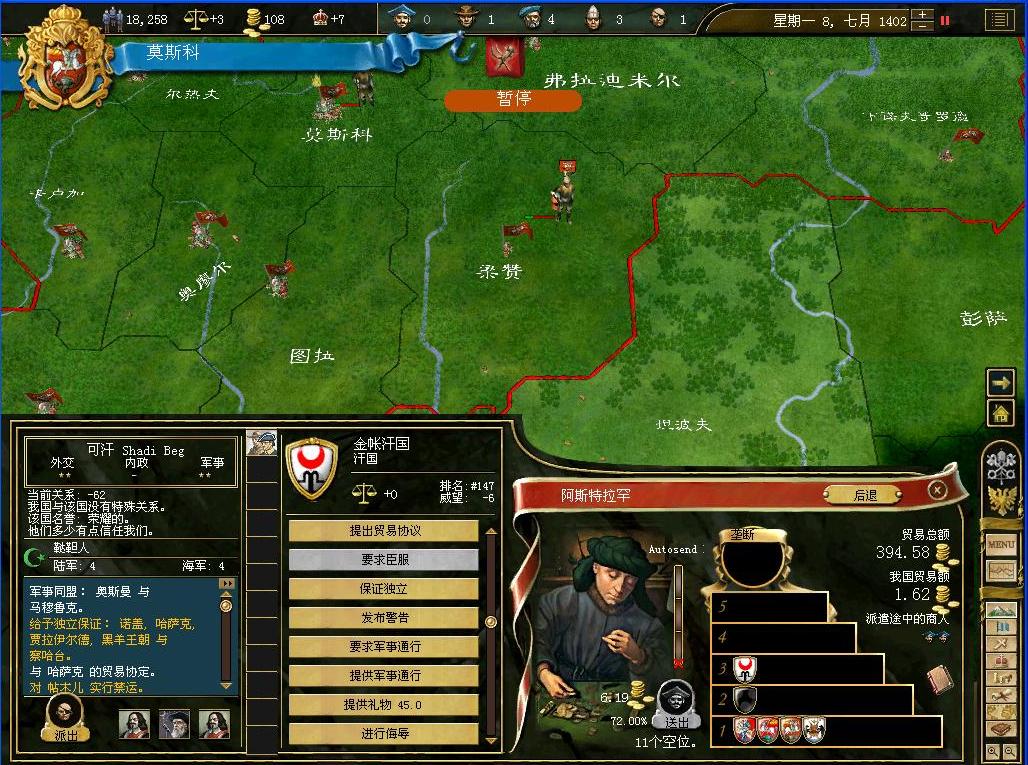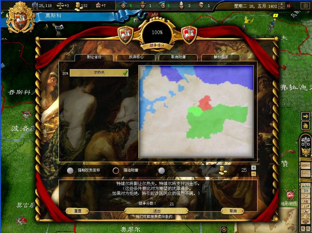 终于,在1402年5月,经过100多天的围困,尔热夫终于被攻破了,威尔特全境解放.可惜的是,因为威尔特并非自会有首都一个省份,所以这次不能吞并了,只好忍痛只要求其割给我1块地,另外给我25金币.等着,我们5年后还会来的