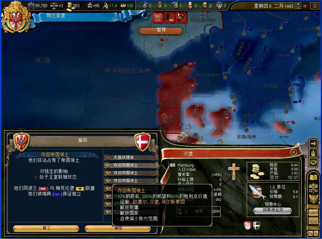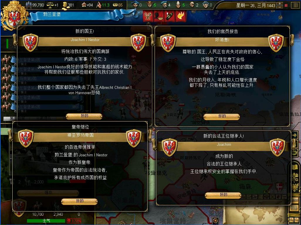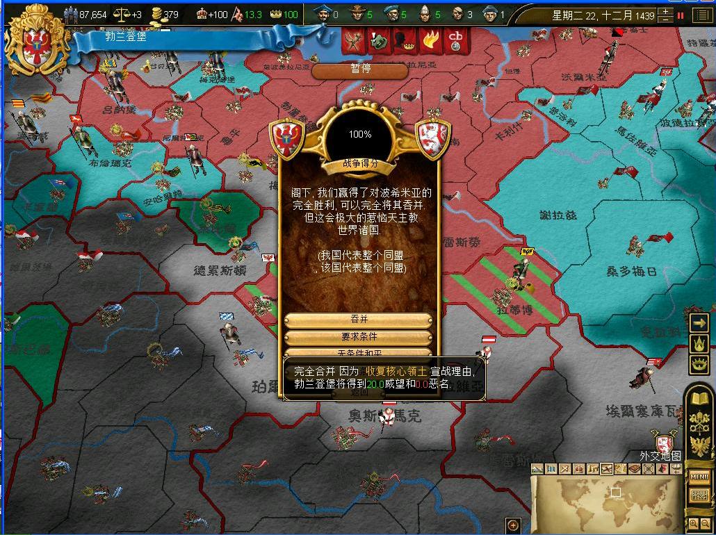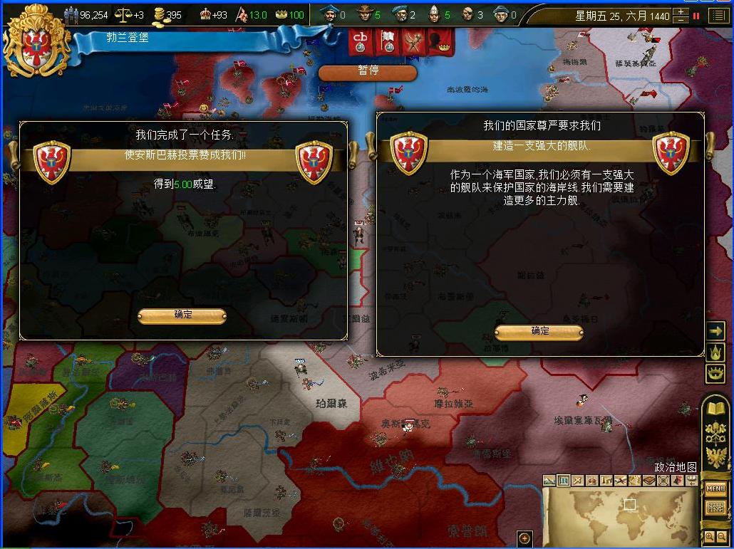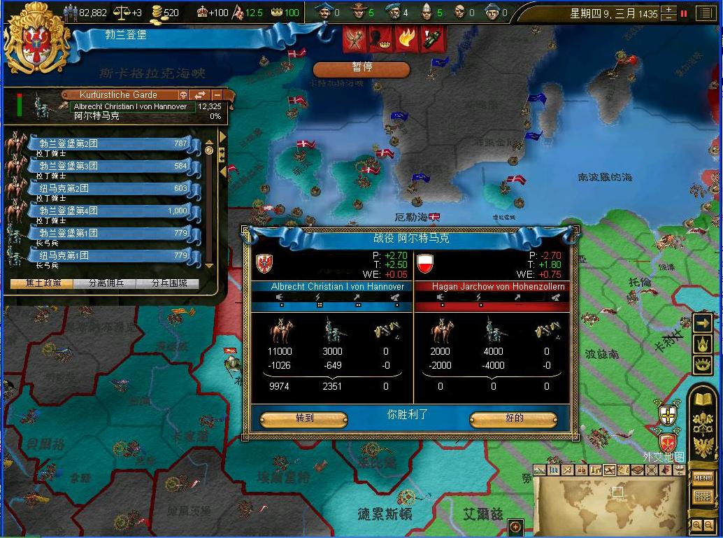 开战后观察了一下外交情况,还算不错,还有几个同盟和我一起作战,西线有两个敌国,都是小国,而且有一个隔着太多国家,没威胁.东西波兰是大敌,但是第一军有15k的兵马,而且大将领军,可以纠缠一段时间,只要西线完成任务,迅速吞并,回军东线,估计就没有大问题了.