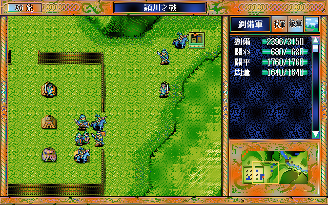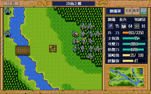 第一回合在右方两格给连弩兵一本浊流书,下一回合右1下1进入荒地,此后注意不挨山计即可。迅速把两个骑兵灭掉,最快第四回合军乐队就能来到身旁。张郃的挑拨成功率非常高,注意不要让他靠上军乐队,等他策略用光就安全了。让郭图靠上两个军乐队,这样每两回合攻击一次假情报一次,能够减少援助压力。刘备初始状态有91点策略,靠军乐队39回合可恢复78点,共有169点,可用30次激励和8次援助。