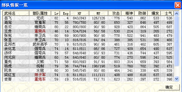 战后等级:岳飞82.04、岳云80.22、汤怀79.57、诸葛英79.48、牛皋80.22、施全79.39、董先71.58、张宪80.69、杨虎79.36、梁红玉74.08、余化龙74.14、何元庆60.54、高宠75.56(未出场)、张显70.10(未出场)、孟邦杰70.09(未出场)、王贵46.14(未出场)、吉青59.19(未出场)、阮良60.30(未出场)。