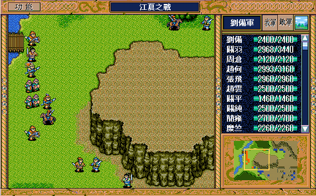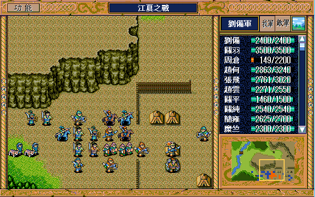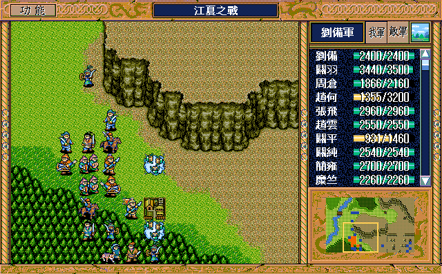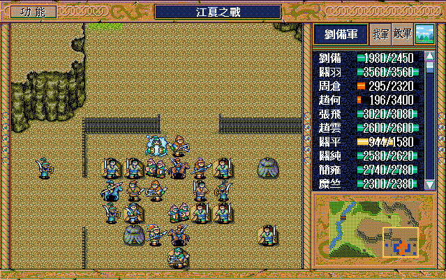 我 周仓左上攻击消灭弓兵1,关平右上激励刘辟,糜竺右激励、赵云左上援助关平,赵何下一,关纯右下、简雍左援助赵何,关羽左下牵制徐晃(失败),刘备右二上二激励自己;