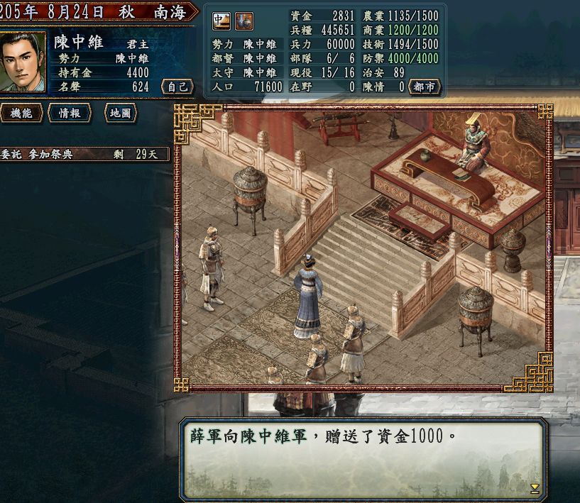 就在我军兵力达6W,准备出兵一举击溃南越时,薛国向我军赠送资金1000,关系变成良好了。。。我还纳闷,薛国为什么送资金给我?于是问宝贝,她说:“有可能他想打楚国,想跟我国搞好关系,说不定到时候会叫我国助他一臂之力。如果真是这样的话,那近期他还会继续送资金来,然后跟我国同盟,助他攻楚。”我说:“原来如此,那我们有6W军力了,可以出兵灭南越了吧。”她说:“神,稍安勿躁,我们埋伏在交趾的勇士被捕了,听说已经慷慨就义,我已派吕尚再去刺探军情,再过几天就可以回来,到时候我们出兵一举灭掉南越!”我不禁叹道;“又损失了一位英才,南越王,你真残暴!我一定要尽快解救处在水深火热中的交趾人民,统一交州。”
