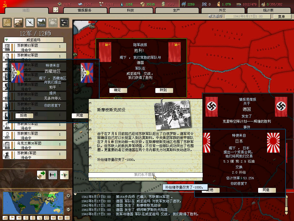事件重复是读档的缘故,有时一个撤退方向不对,二十几个师就给坦克撵上了