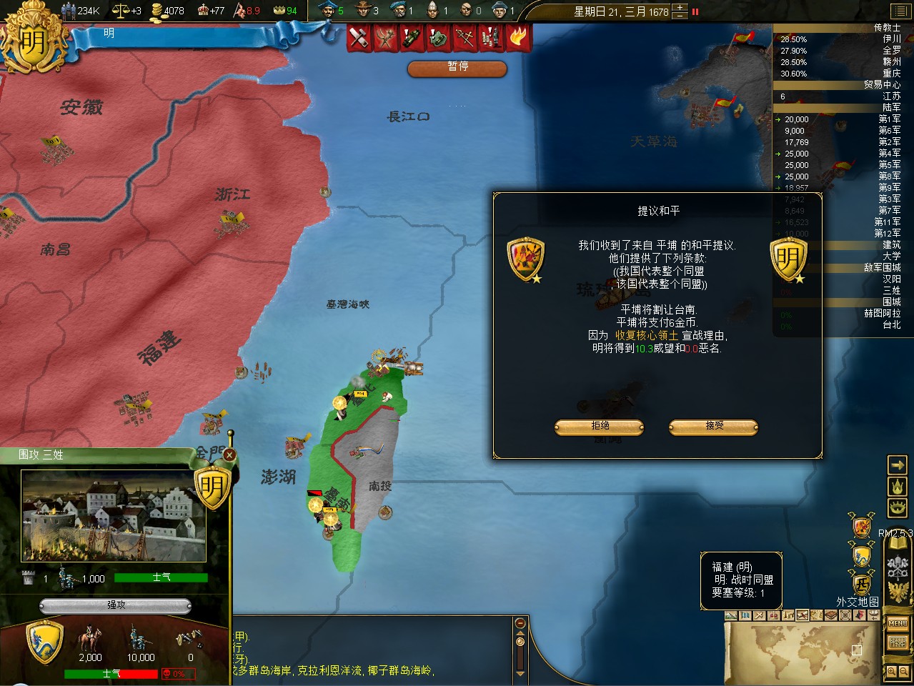平埔请降,主动割让台南。正好,我国支持的爱国者也在向台北进发。就交给爱国者吧。