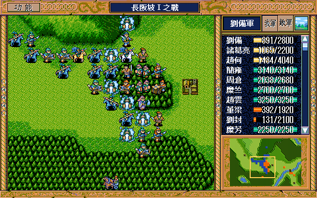 敌 李典左下攻击赵何(明显攻击糜竺或董梁的行动价值更高,却只攻击赵何,可能和刘备的位置有关),夏侯惇左攻击董梁(反击),夏侯渊左攻击赵何,张郃左攻击简雍,曹洪左援助夏侯渊,贼兵3左上攻击诸葛亮(明明在原地山上就可以攻击,非要左移一格,而且刘备和他还紧挨着,真不失漂移本色)。