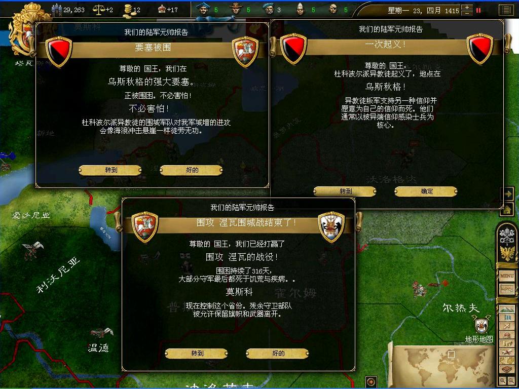 罗马,你怎么没事跑去打土著啊?你又不是马上要殖民。还有你怎么拉了人海啊?会掉训练度的。一般都是拉精英的。而且人海只-步兵成本,对俄罗斯这种骑兵大国,尤其是你现在农奴满的情况下,一点用处都没有。另外,战争期间,敌军未探索区域是可以直接点进去的,只是速度慢而已。