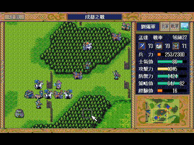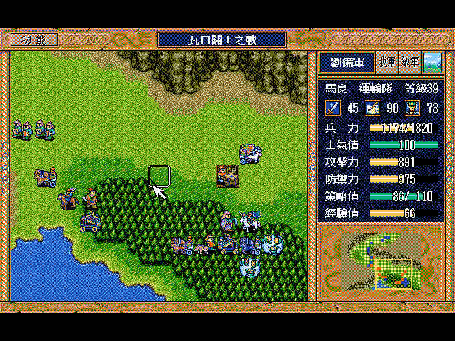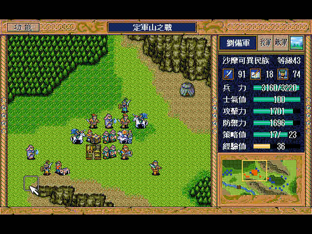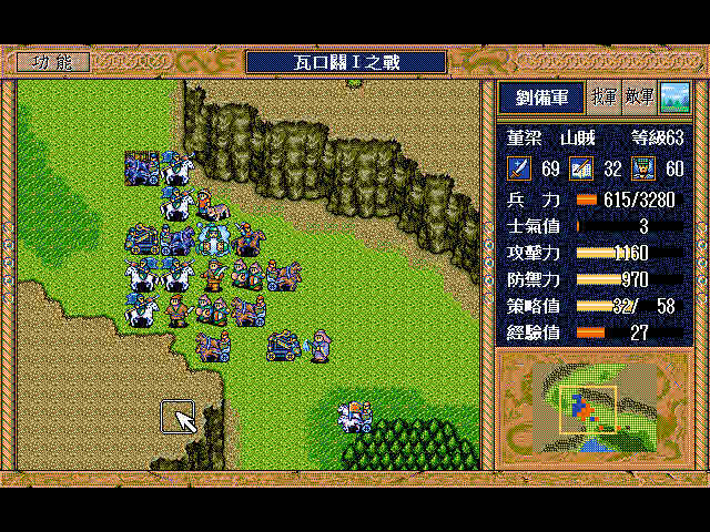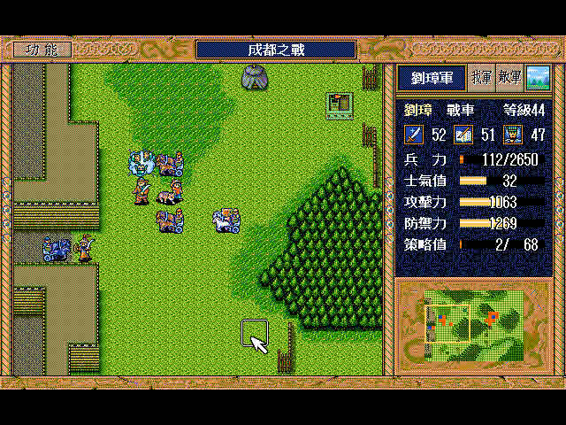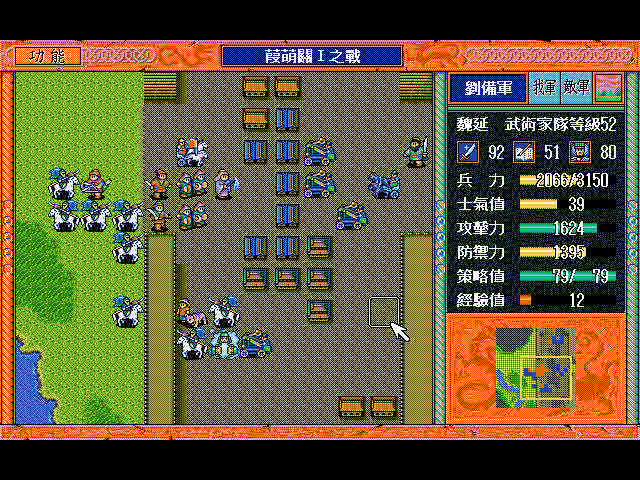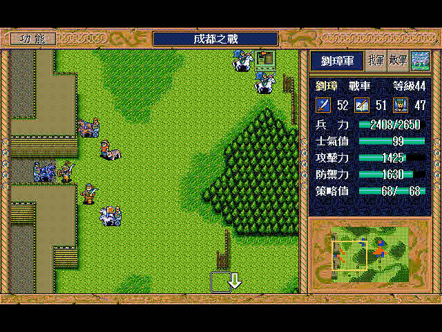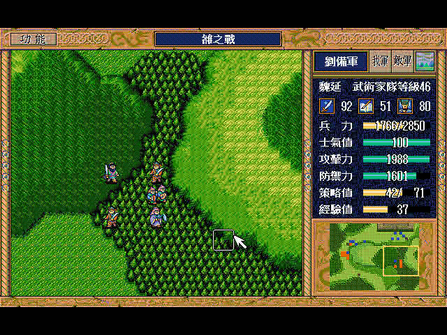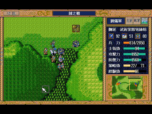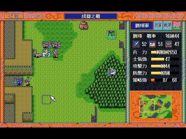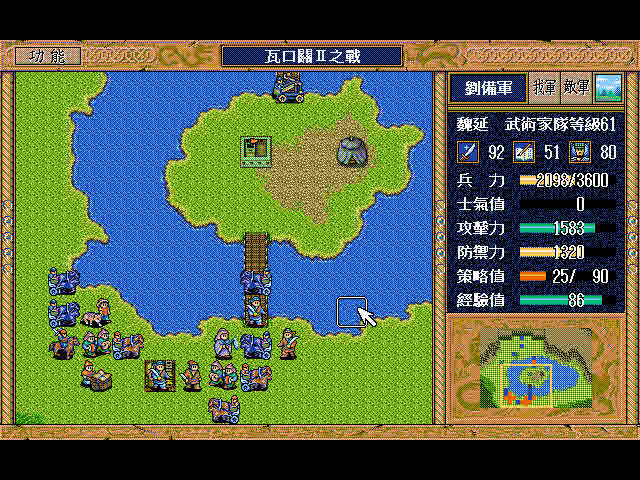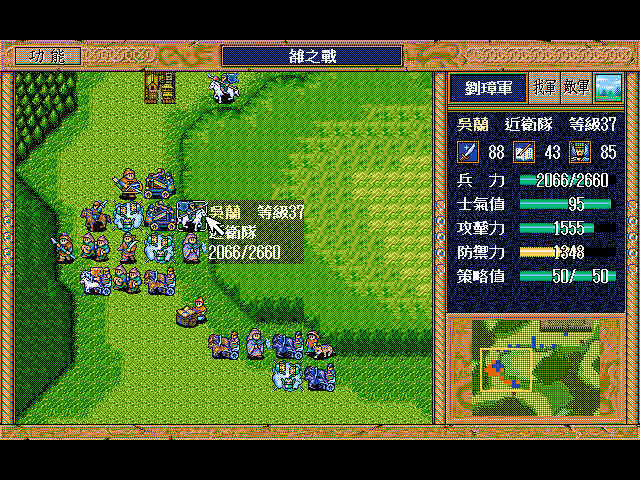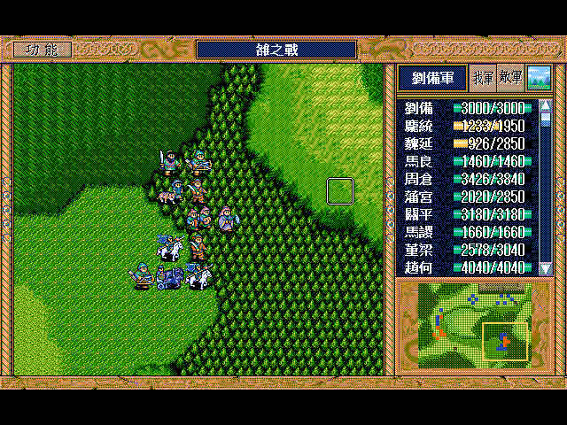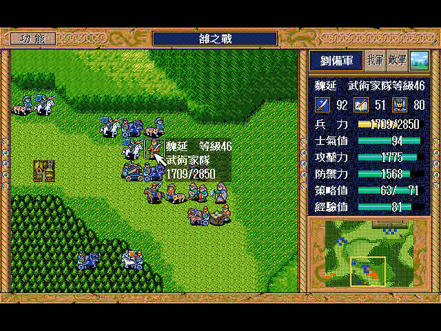 敌:刘贵上攻击魏延被反击,冷苞左上火龙魏延失败(这个容易),弓兵一个右援助刘贵一个在冷苞左边攻击魏延