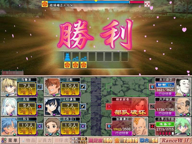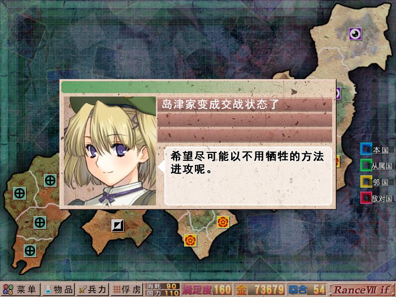 第三阶段,灭了明石,打下毛利的出云,就可以触发大决战了。大决战胜利后,可以捕获三妹抖,同时入手一块地域,注意一定要在灭毛利之前,抓住二姐,否则二姐无法信赖。现在就可以扔下毛利不管,50回合左右就可以宣死国,死国很好打,2-3回合搞定,顺手可以触发元就的诅咒剧情。然后立刻宣JJ,同时宣北条,不然北条不是被吞,就是剧情丢琦玉。这时候是4线作战,但依旧不是很难应付,北条那边防守反击,主打JJ这边,拿下MAZO后,打下佐渡一丸后等剧情后灭JJ。然后从琦玉方向开始进攻北条(江户那边是三高塔),陆续拿下琦玉和上总2000.早云禁止兰使用朱雀两次后,捕获兰,次回合早云失踪,北条元气大伤,劝诱兰,然后发展剧情,出现油田迷宫,打通,兰死,早云会在之后的剧情自动加入。然后搁置东线,转回西线,灭毛利,收三妹抖,砸友好度,触发4P剧情,父女四人一起出击,2周目就可以像我一样,直接追加三妹抖了。5葫芦破,进入本能寺之变。大约只需要70回合左右。