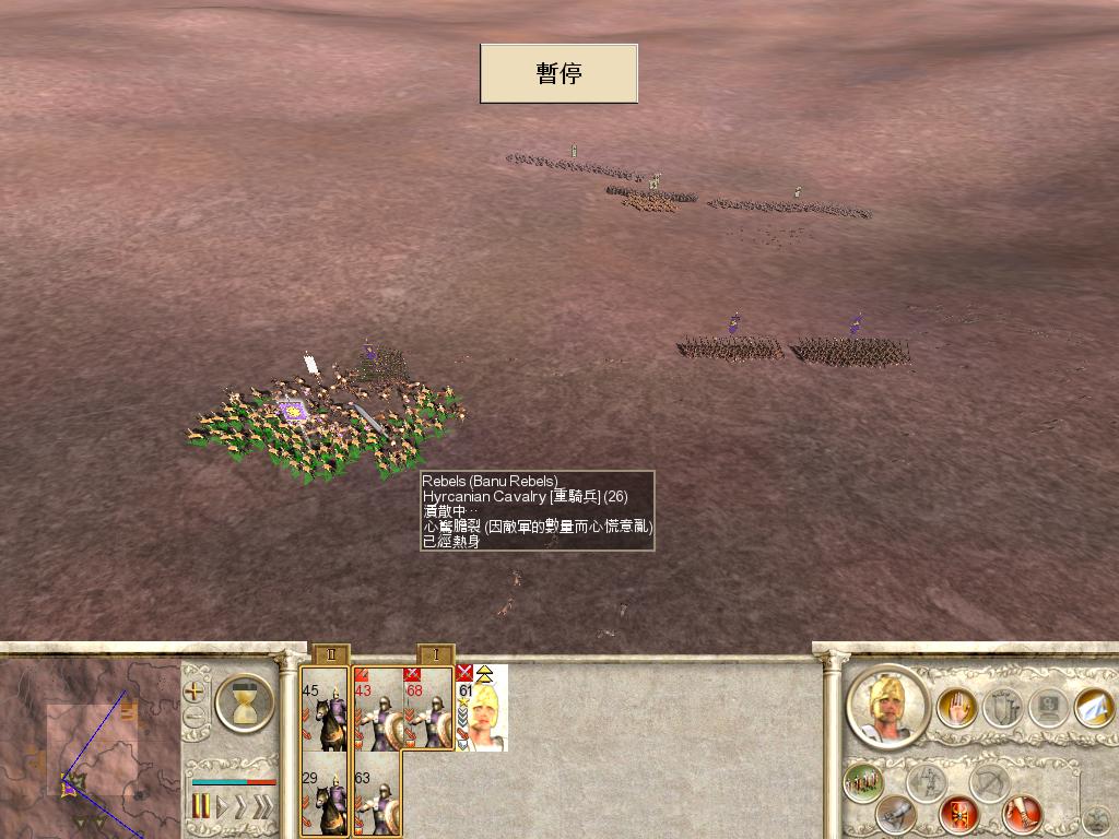 尽管普拉克西诺斯军团还在紧急赶来的路上,但是我军已经不能在白白等待下去了,因此亚历山大军团挑选出最精锐的3队重装步兵和2队轻骑兵,在已经达到6级经验的亚历山大卫队的带领下,冒险对巴比伦发动了一次攻击。由于巴比伦城外的叛军加上巴比伦城的守军,人数是亚历山大分队的两倍,因此两股敌军决定与我军进行野战