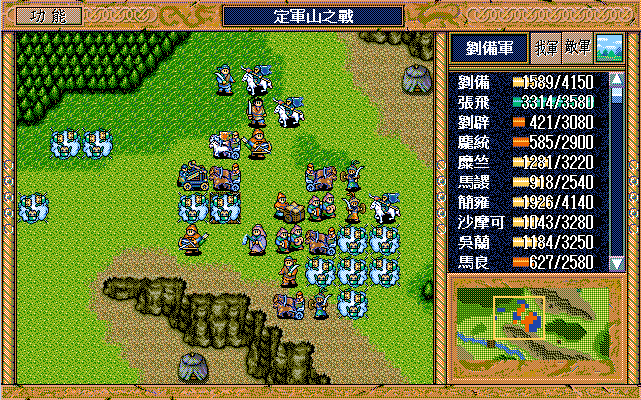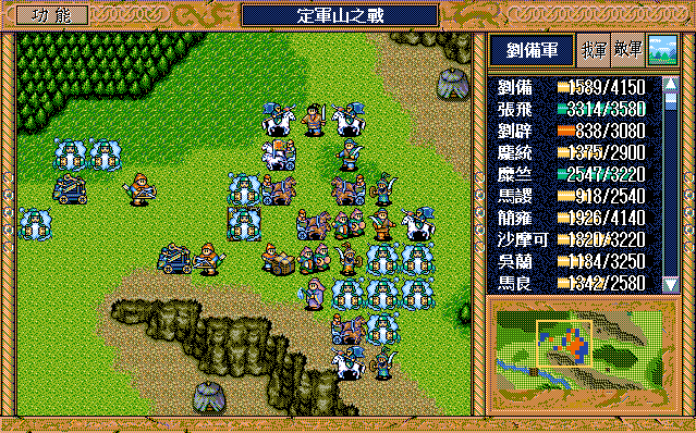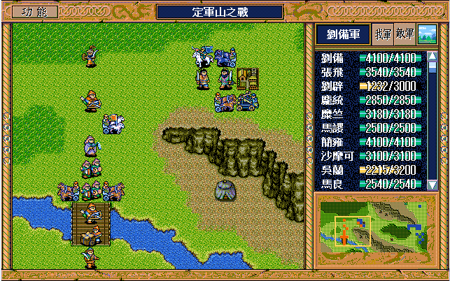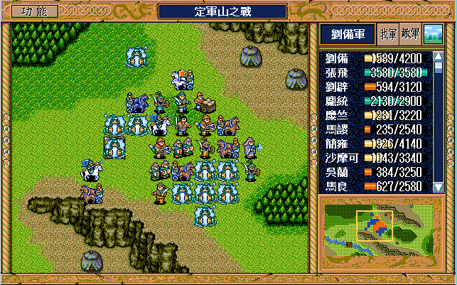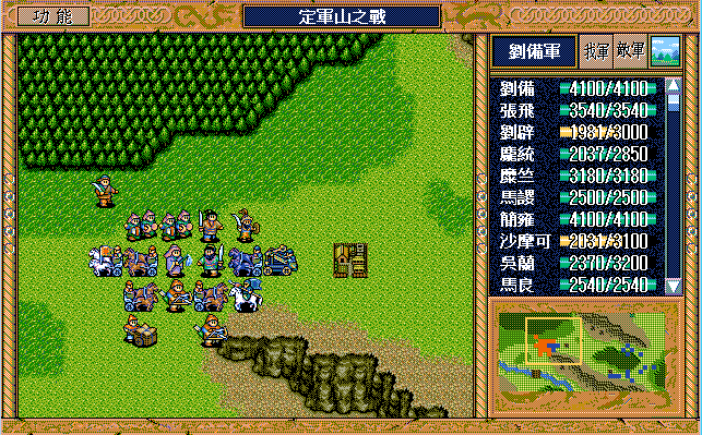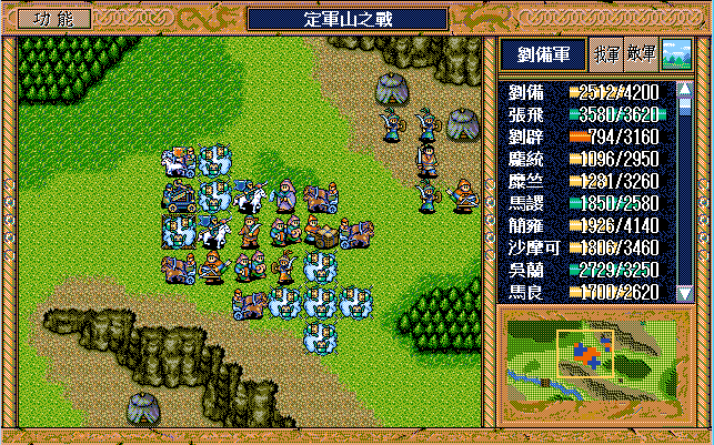 敌 弓兵1原地浊流(失败),夏侯渊右下激励异民族2(升级),夏侯尚右右下下攻击庞统,步兵1原地援助弓兵1(少,同样是为了防止他攻击马谡),步兵2原地攻击沙摩可(奇怪不用火龙,应该跟刘备有关),骑兵2右攻击魏延,骑兵4下攻击吴兰,异民族1右上攻击魏延,异民族3右下攻击吴兰,骑兵5上攻击魏延,骑兵6右攻击张飞,骑兵9左攻击刘备,弓兵2左方两格浊流简雍(失败,三回合)。