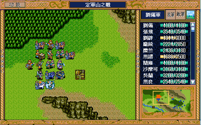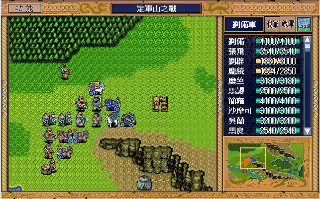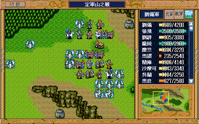 我 庞统下一,糜竺左上激励吴兰(从此不变位置),吴兰左下假情报、沙摩可左攻击骑兵7,刘封左上援助吴兰,马谡左上激励沙摩可(从此不变位置),糜芳左上假情报张郃,张飞下援助刘辟,简雍原地假情报徐晃,刘备左援助魏延,魏延左下焦热书骑兵3,刘辟左下援助魏延,马良左下援助刘辟,王平上攻击消灭骑兵1;