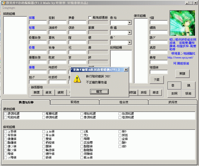 很多人对修改器上的姓名之类不能修改感到疑惑,其实这是最初设计时为加入新武将登录功能而做的通用界面,当然,在实际中,存档中的新武将名称也是可以修改的。