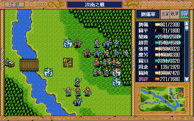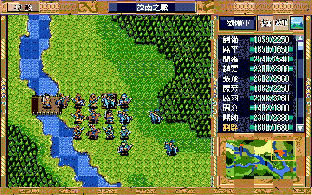 我 藩宫右方两格火龙(成功) 张飞右攻灭郭嘉,关羽右攻 简雍右上射灭步兵3,赵云右上牵制骑兵2(成功),关纯左上射灭弓兵2,刘备左4;