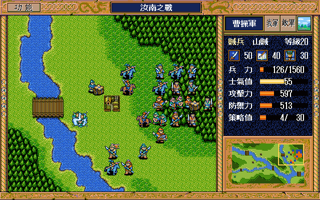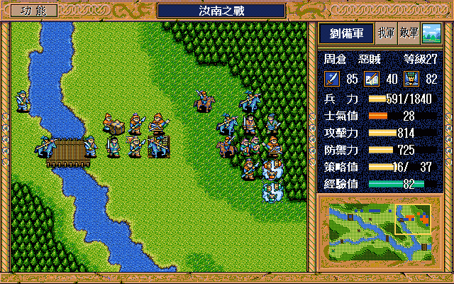 我 刘备右攻 简雍右上漩涡灭弓兵3,关羽下方(成功) 张飞右方牵制夏侯惇(成功),赵云右1下2激励自己,藩宫下方火龙(成功) 关纯右方两格火龙书灭李典;