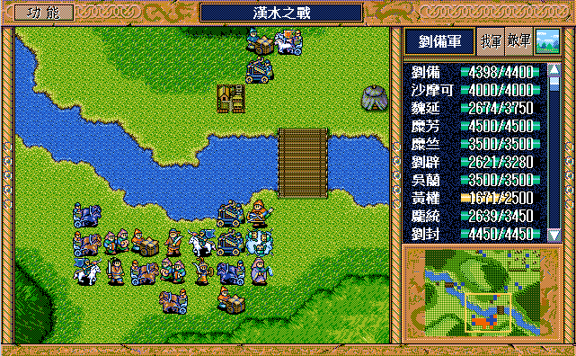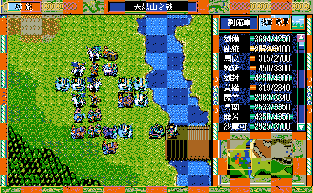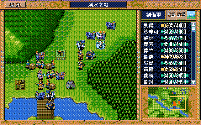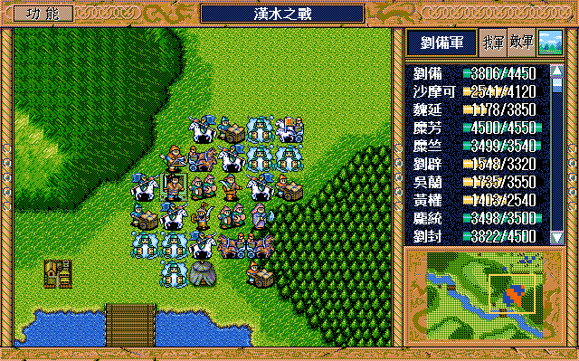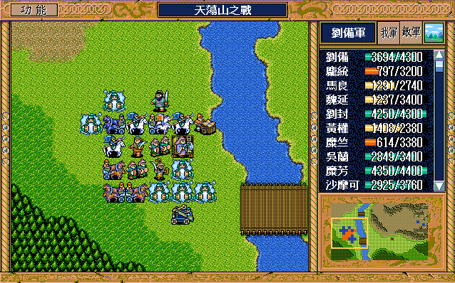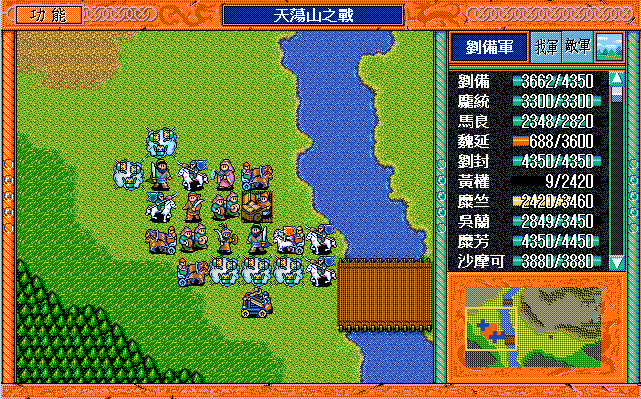 我 刘辟右二下二援助、刘封右下援助、黄权右交援军报告给刘辟,糜芳上激励、马良右下援助黄权,刘备右二上二援助、张飞左下激励刘备,庞统下牵制、魏延原地攻击步兵2,糜竺原地激励、吴兰下援助糜竺,沙摩可左下焦热书骑兵2;