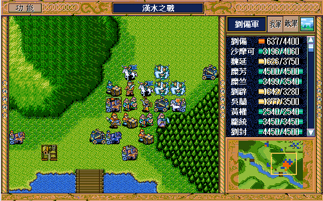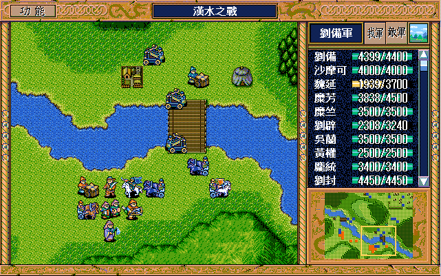 我 吴兰右三上一,糜芳原地假情报运输队2,黄权激励张飞,张飞原地假情报步兵1,马良原地救济魏延(反正策略值要补满),糜竺激励沙摩可,王平下二援助自己,刘封右下援助马良(二回合),刘备右二援助自己,刘辟左三下一;