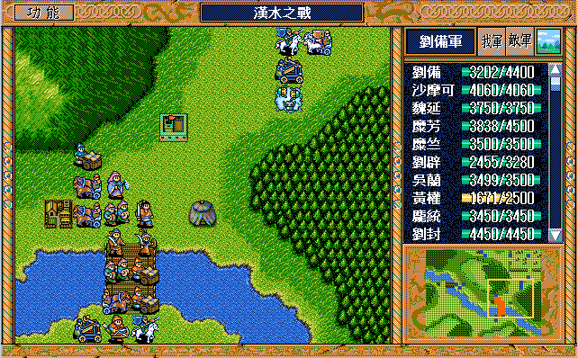 敌 骑兵6左下牵制或挑拨刘辟(成功),运输队1左三大救济,骑兵8上攻击吴兰。