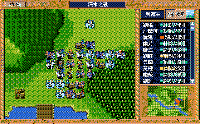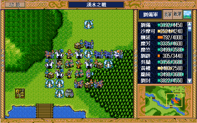 敌 步兵1(清醒)开始火龙沙摩可,曹彰上、骑兵9左攻击刘备。