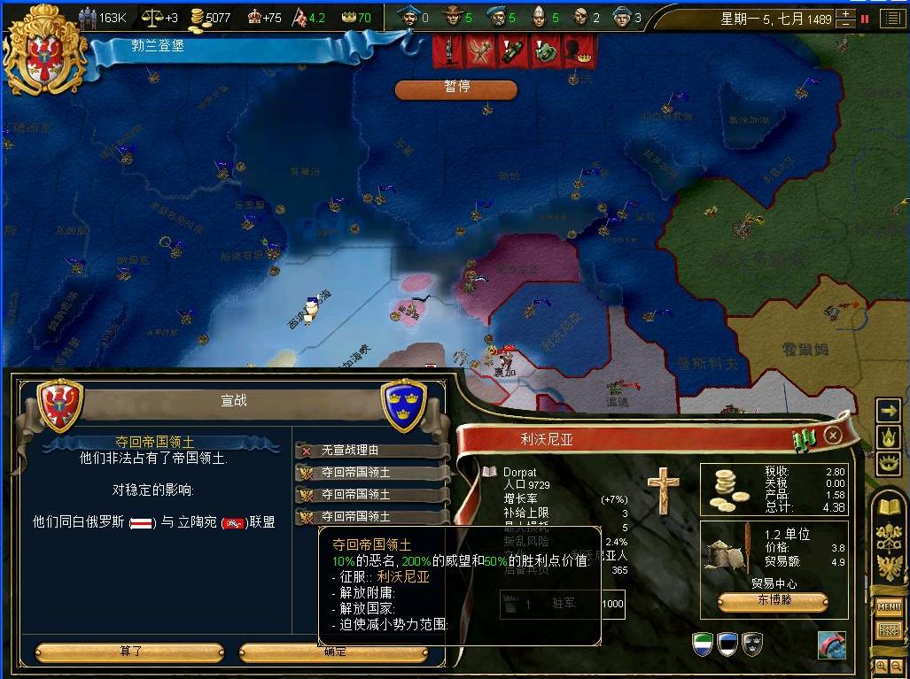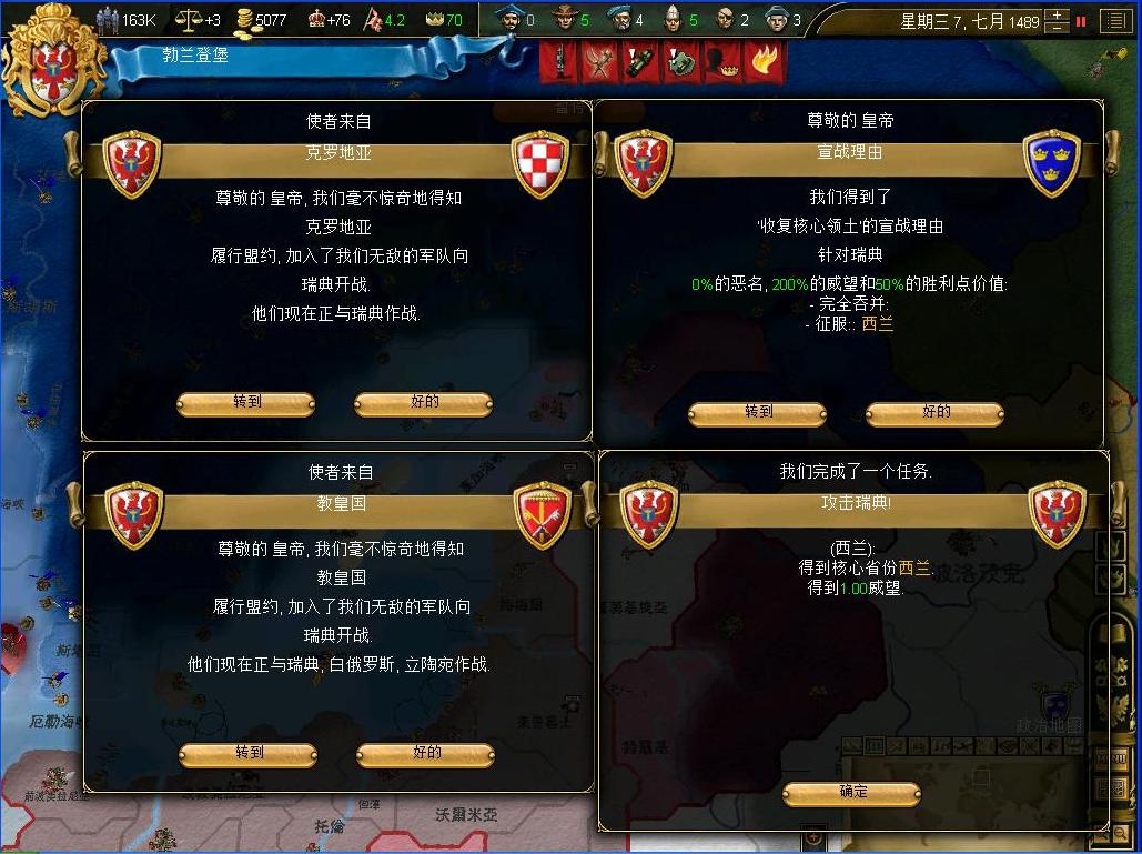 对方也不是善碴.....不过还好我帝国的海军比他们强一些,在厄勒海峡把瑞典海军歼灭了,他们陆军别想通过海峡一步,另一方面,瑞典的同盟国立陶宛的小股骚扰部队也被歼灭在特洛基城下