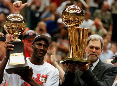 1998年6月14日,乔丹最后时刻从卡尔-马龙手中抢断成功,投入制胜一球,帮助公牛队以总比分4-2击败爵士队。公牛获得第二个三连冠,八年中六夺总冠军。乔丹也再次当选总决赛MVP。图为乔丹与当时公牛队主帅“禅师”杰克逊分别MVP奖杯和总冠军奖杯。