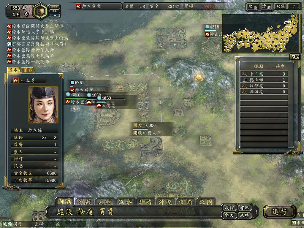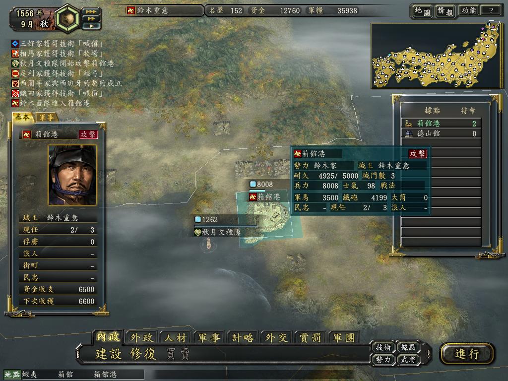 俺一直比较喜欢铃木家,在北海道当然比在纪州惨的多,55尾张剧本围下筒井很轻松,就是围不下,偷也很容易,有了百地、岛猛男、泷川基本就在近畿无敌了。应仁这个剧本初期的铃木,就是一个字-龟,然后相时而动,利用铁炮的优势港口作战,一旦拿下大友和岛津,大友的风雷二神足轻在前面顶着,重秀+岛津四兄弟在后面放铁炮,怎一个爽字了得