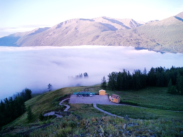 生物钟很灵地把我们叫醒,东方开始露红了。趁着黎明前的曙光,惊喜地发现,大朵大朵的晨雾竟是触手可及,而雾的下边,正是白天大放异彩的湖水。不知是水的魔术在继续而成了雾,还是雾偏要抓紧时间盖过水而成就自己的美。