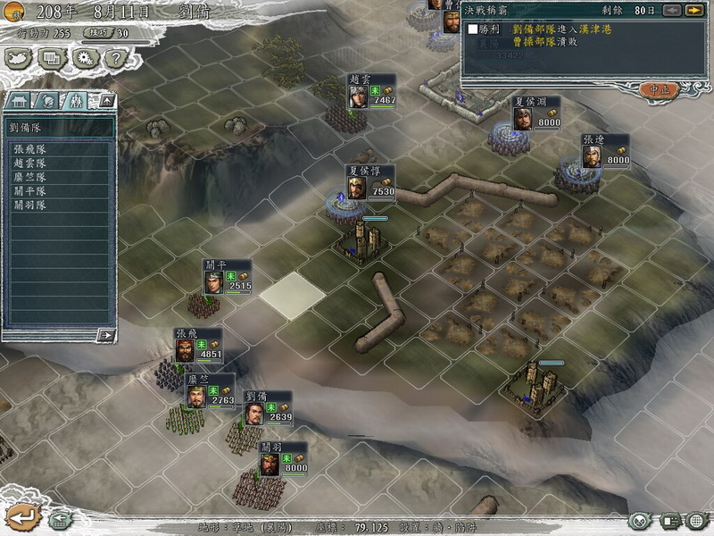 5.        在50天后,传说中的五虎上将关张赵马黄各带领8000兵从我军初始的西面位置出现,我军士气上升20,战局就此彻底逆转,因为这可是五支具有超强攻击的生力军,尤其关羽的特技神将又是那么的好用