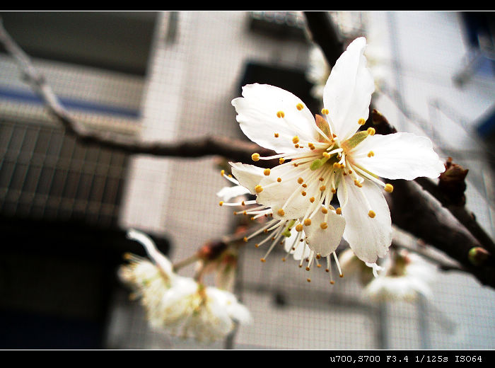 看似梅花却不似,不知是虾仁花。那个晶格状是后面楼房的瓷砖撒,镜头不奇怪吧,拍微距偶尔会有二线性。