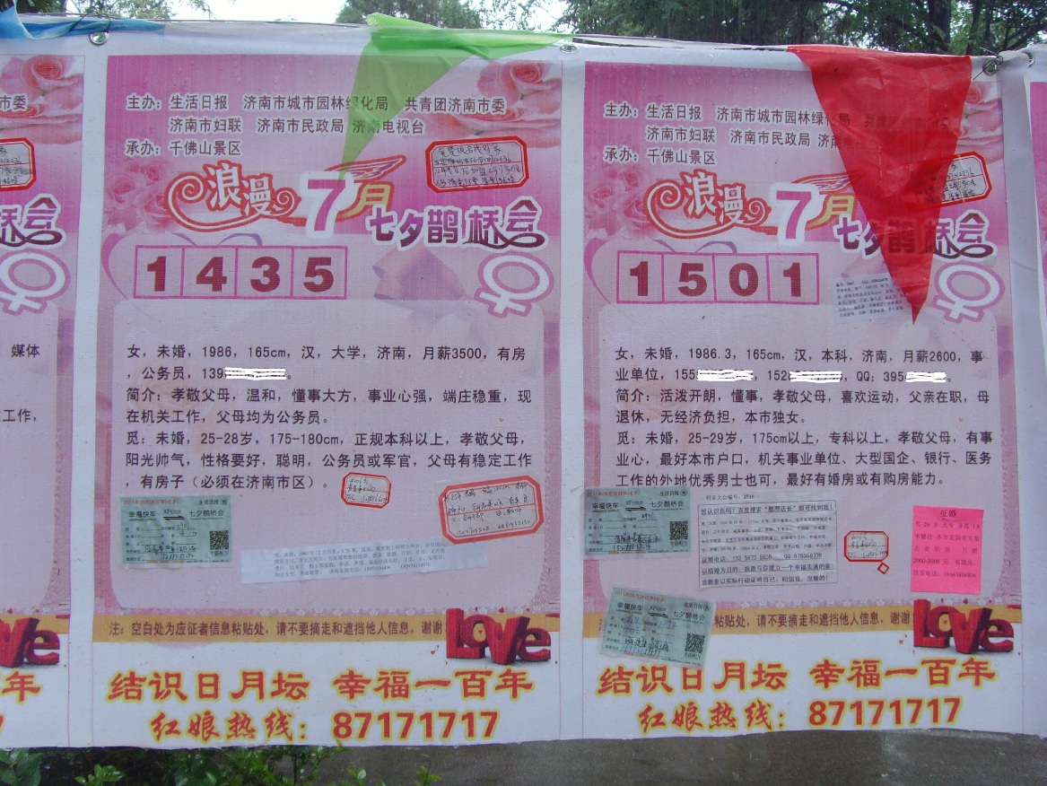好的方面就不多说了,这次七夕相亲会要说最可气的就是千佛山公园和生活日报和移动公司之间的利益勾结了。以往相亲会信息都会刊登在生活日报上,而这次马路上卖的生活日报只刊登了少数人的征婚信息,而绝大多数征婚会员的资料则撰写在了一份生活日报相亲会专刊上面。这份专刊只在公园内出售,逼着一部分没报名的人要进门买票再买报纸,而生活日报更可气,这份专刊一份高达10元钱,这么贵不说,会员资料里还没有联系方式,还要满山上对号寻找,真气杀人也。