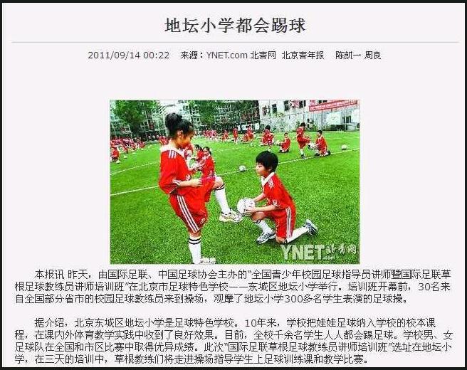 10月25日,北京地坛小学足球队与俄罗斯伊尔库茨克州少年迪纳摩足球队踢了一场友谊比赛,结果以0-15收获一场惨败。尽管不是国字号男足的“惨败”,但结果仍令人惊讶。这支俄罗斯小学球队曾获2011年西伯利亚联邦区冠军,实力很强。据地坛小学杨校长介绍,俄罗斯的小球员均为“00后”,而地坛小学队员是三、四年和五、六年级的混编球队,在身高上有优势,但技术方面仍有待提高。比赛中,身材高大的中国学生跑了20分钟就气喘吁吁,踢得没有战术配合,也没有最基本的拼抢动作。