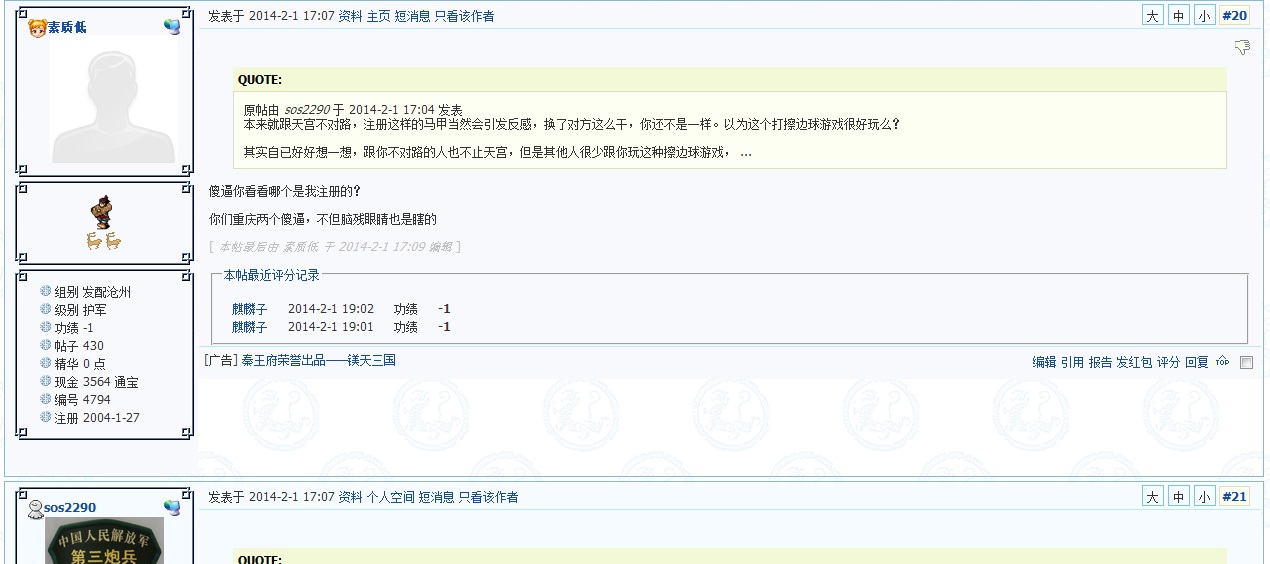 春节期间,《[建议] 其实换谁管登文鼓都一样的》在该贴中发帖人ID“素质低”论坛账号4794,在第20帖和第32帖,采取“傻逼”类词语,实施人身攻击,目无轩辕规定,构成中度人身攻击,事实清楚,证据确凿,虽在32曾予以编辑,但依旧构成带有地域性人身攻击,大过年的不想封人,扣除功绩六点,以示惩罚。