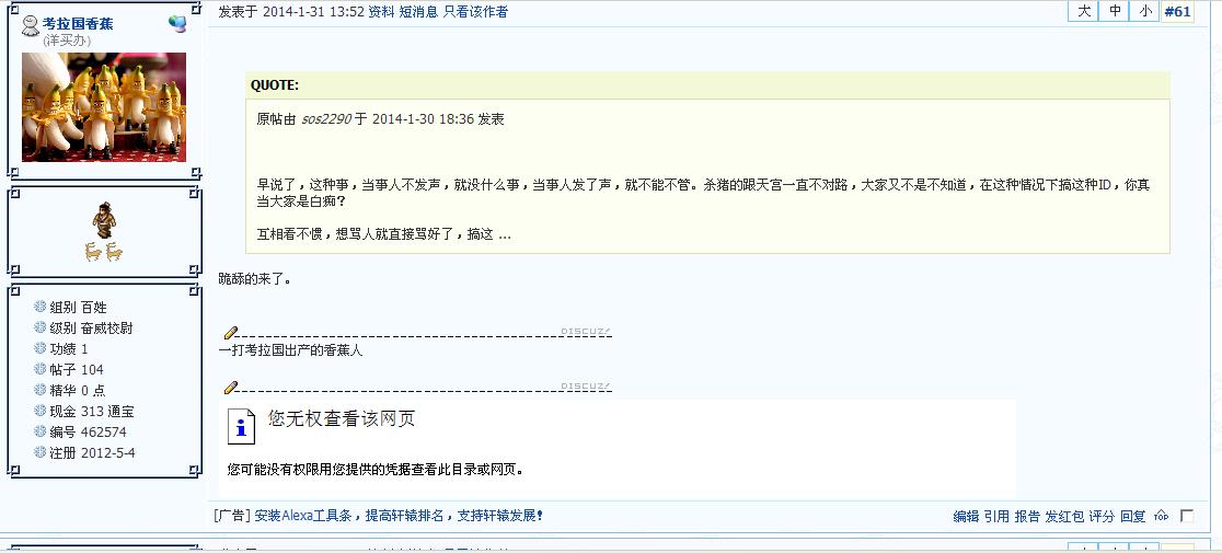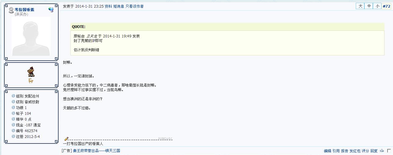 登闻鼓《【注册申请】我想注册一个天宫皇阿玛的id,可以吗》一贴中,账号考拉国香蕉 (编号462574),无视登闻鼓版区规定用词低俗,对sos2290等会员有恶意挑衅行为,证据确凿,事实清楚,封禁两周,扣500分。