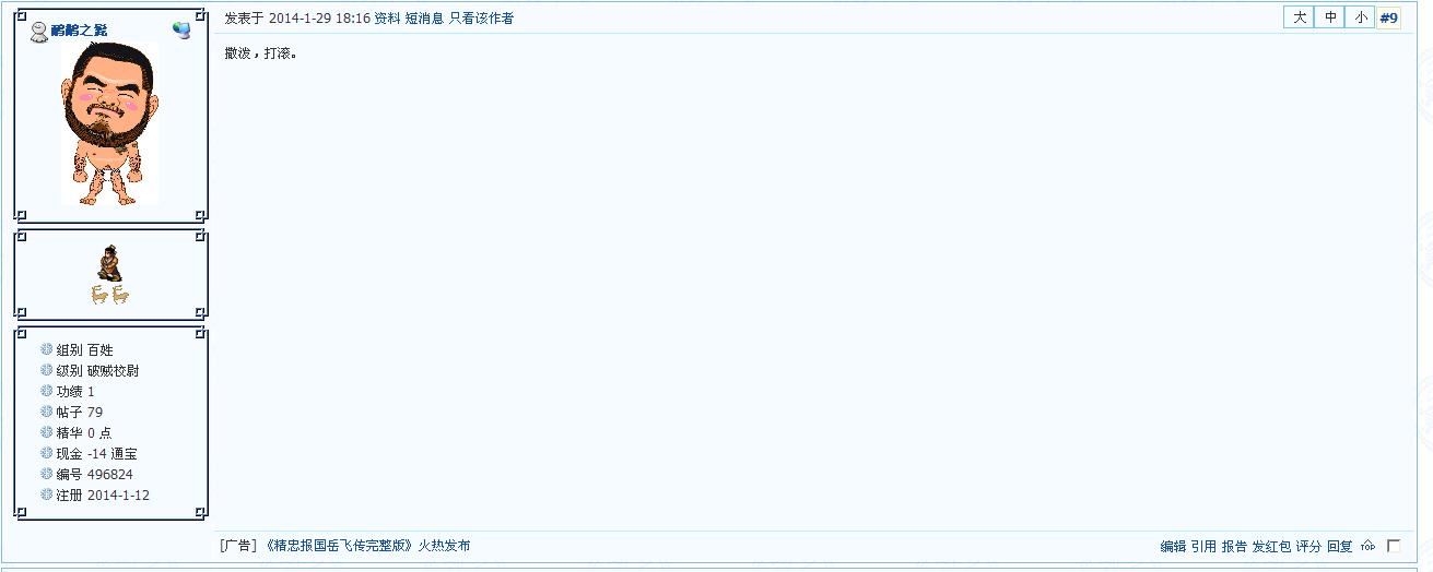 在登闻鼓版区《KYOKO 无事生非,不配当节度使 》一贴中恶意灌水,并具有挑衅行为,其积分已经扣负,依然无视登闻鼓严肃性,鉴于此扣功绩2点,以示惩罚。