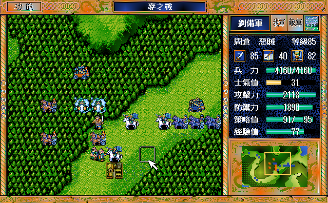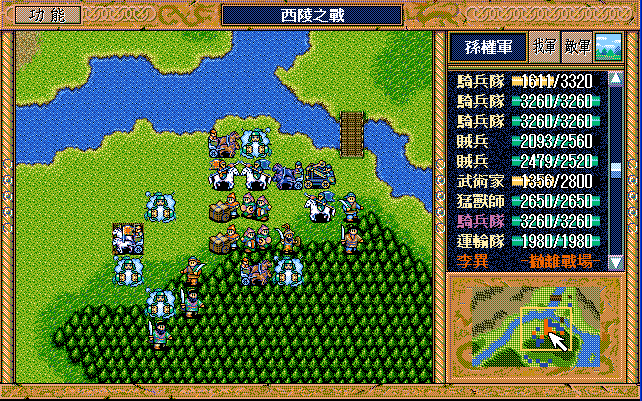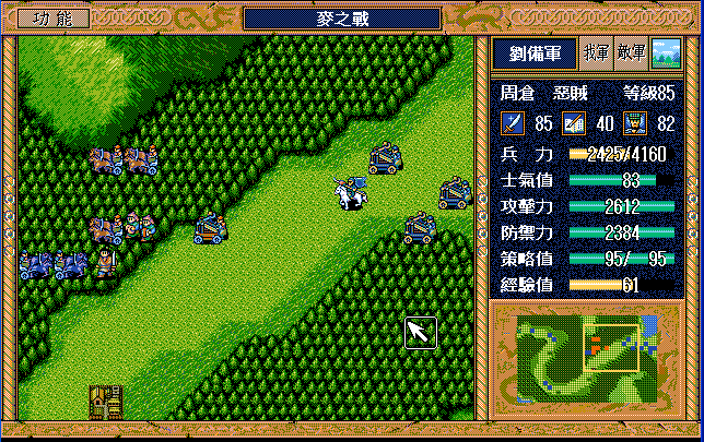 第24回合后:孙桓援助的差不多了刘备把骑兵混乱,放孙桓下来攻击马良,刘备绕过去准备卡位,沙摩柯在合适的时候灭掉上方步兵,让孙桓到这个位置,这样才能大策略吃主将。运输队醒来后大救济,然后到村庄左侧补给骑兵,糜芳混乱之,不能让他进村,否则后面没法利用村庄给骑兵补血了。魏延左侧骑兵血量不足时进村挑拨糜芳,左下骑兵醒来上移攻击魏延,运输队左下攻击魏延重新成阵,然后糜芳混乱村中骑兵,刘备攻击严畯并卡位,严畯醒来开始援助魏延下方骑兵。后面主要就是sl敌军的援助对象,敌军两个贼兵的策略真讨厌,中间用过若干次策略,否则还能多反击几下,体力是足够的,最后只能反击死猛兽和武术家,两个贼兵体力基本满的。