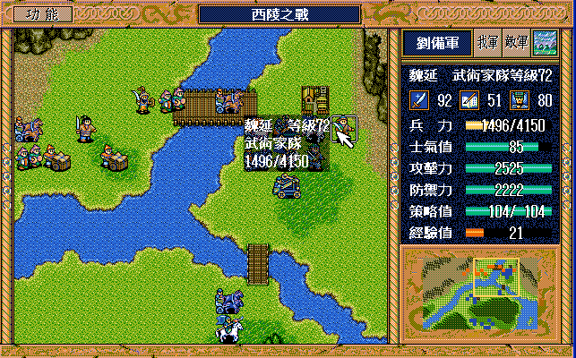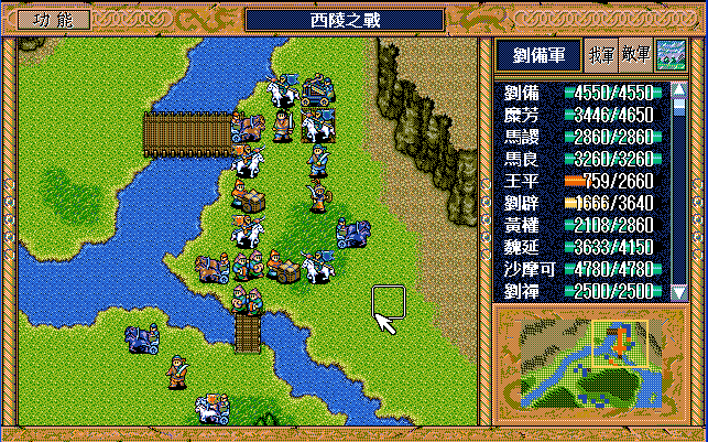 第5-10回合:魏延后退攻击步兵,把骑兵引到桥上方,然后刘辟断后,刘备魏延当前锋过桥,中间控制敌军步兵的援助对象。