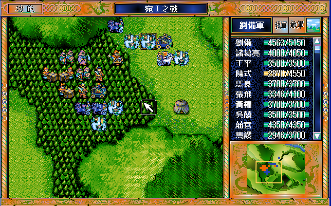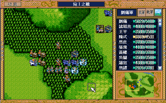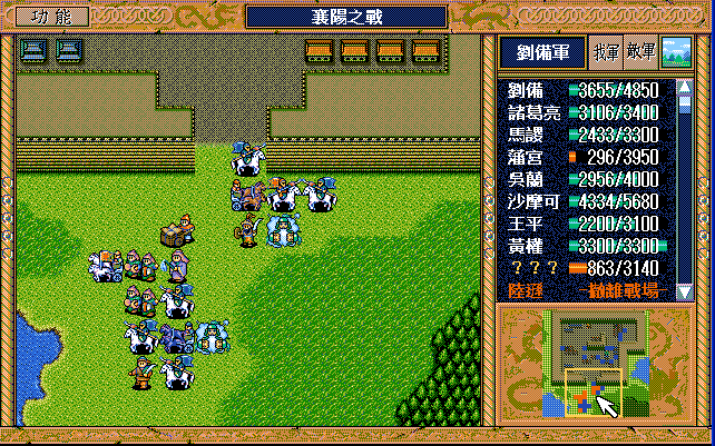 第4回合:孔明把赤兔马交给刘备,刘备助攻沙摩柯灭毛玠,其他人往城外退,潘宫左移,不能给潘宫补血