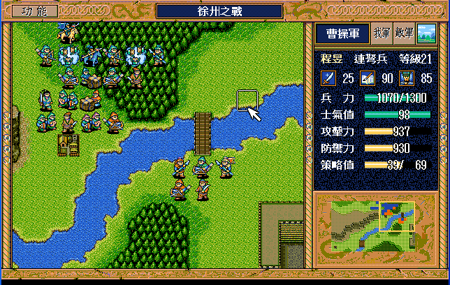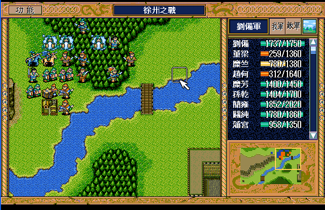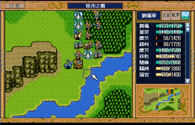 我:关羽左牵制刘备左上攻击关纯右上上灭弓兵,糜竺上方攻击赵何右上牵制(失败)张飞进村牵制乐就(失败),简雍右侧激励张飞,其他人跟上