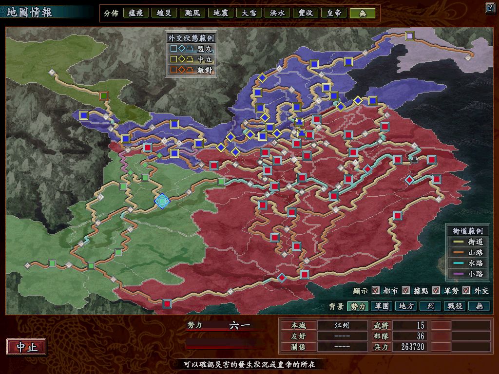 不是我不爱惜。。是阿斗发疯了。。我砍了张苞他找我报仇。。来车轮打战。我根本没机会发展内政。。战斗一结束我就要招兵练兵,,阿斗的人根本上是一个季度来一次骚扰。从没结婚就开始打我。打到现在我的孩子都14岁了。终于。我把阿斗的猛将都砍的差不多的时候我的城市还有4万5千人口了。我就带着13个将10多万钱和上百万粮食流浪去了。招满了人就拿永安下手在就是江州。江州比较的好。可以开发木兽。但是我等不及时。但是我等不及了。点上7万人带上霹雳车。从梓潼再成都一路杀到永昌。杀的都没粮食了。抓一个宰一个。最后在永昌把阿斗的一半多人全逮到了。。只投降了一个什么泰的 其他的全宰了。。带上阿斗只有一个武威了。我也刚刚开发出木兽了。。等批量生产后就“借道”小曹的天水再把阿斗灭了。把他的人搞过来。。我现在手上将实在是太少了。。委任了西南6城的光棍太守外就不到10个人。又要大家有要生产治安征兵发展技术。累。