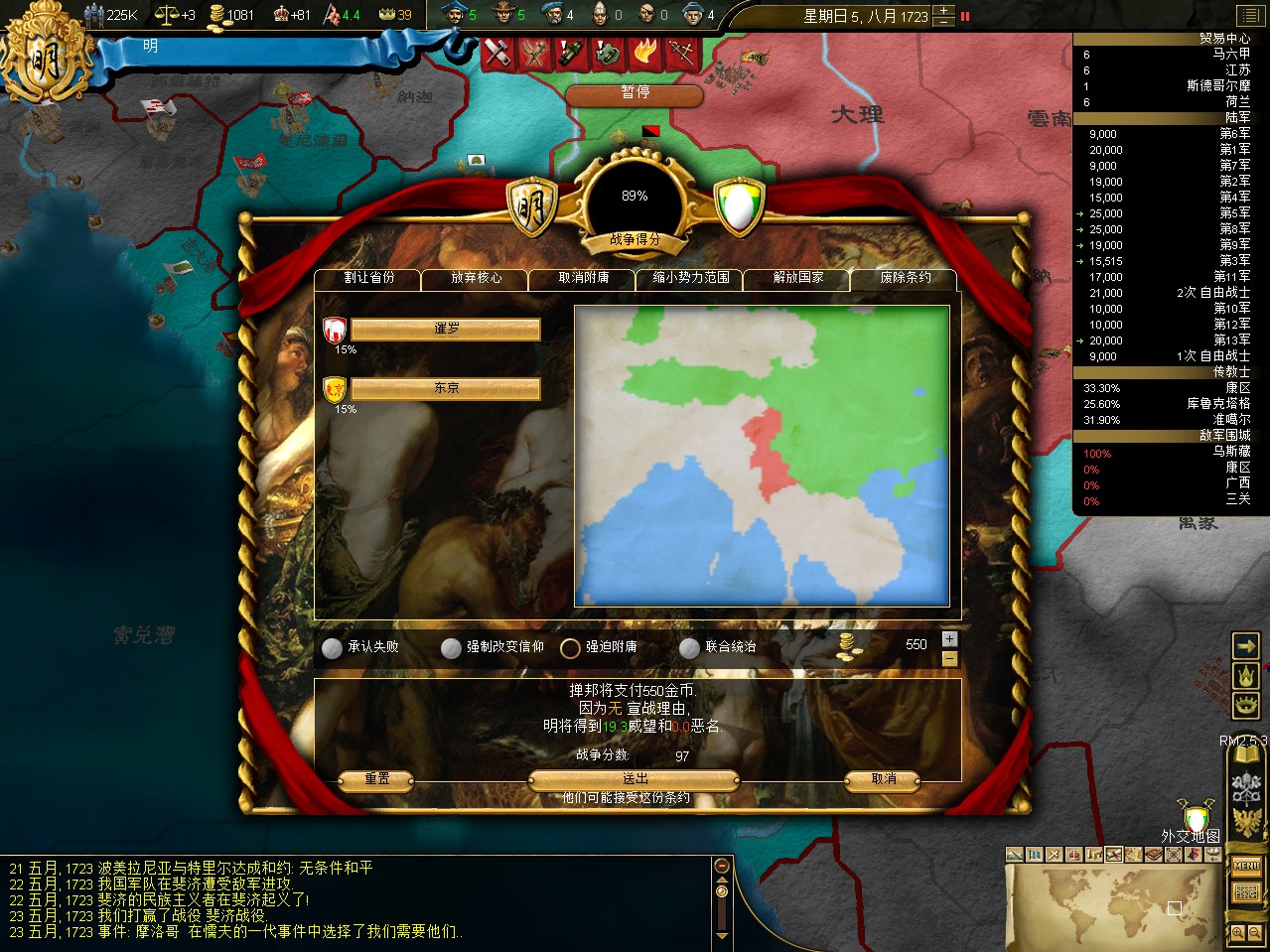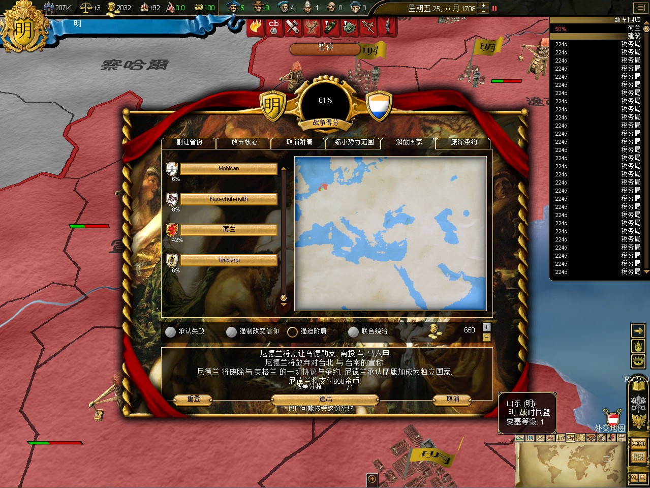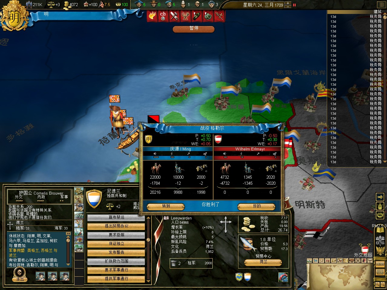 奥地利军溃灭,尼德兰本土被占领。可以跟尼德兰割地了。南投是肯定要拿回来的。马六甲这个贸易中心也要割下来。再割下乌德勒支作为我国在欧洲的立足点。