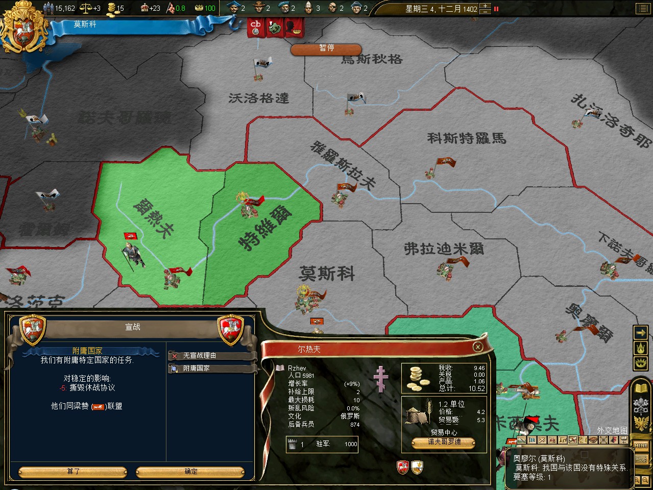 开局拉一格中央,其实这是坏习惯,莫斯科初始才5000兵,但如果拉出叛乱在莫斯科,刷出1w3的叛军,可以直接重开了。不过这次运气不错,叛军在卡卢加,还是篡权叛军。这样正好帮我挡住了立陶宛的两股民族主义叛军。民族主义叛军占领后会加十年的民族主义,而篡权叛军没惩罚。