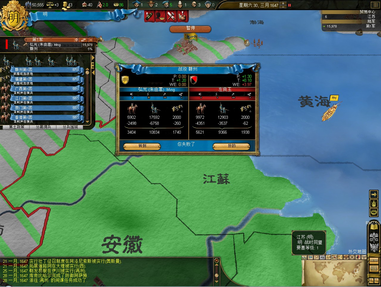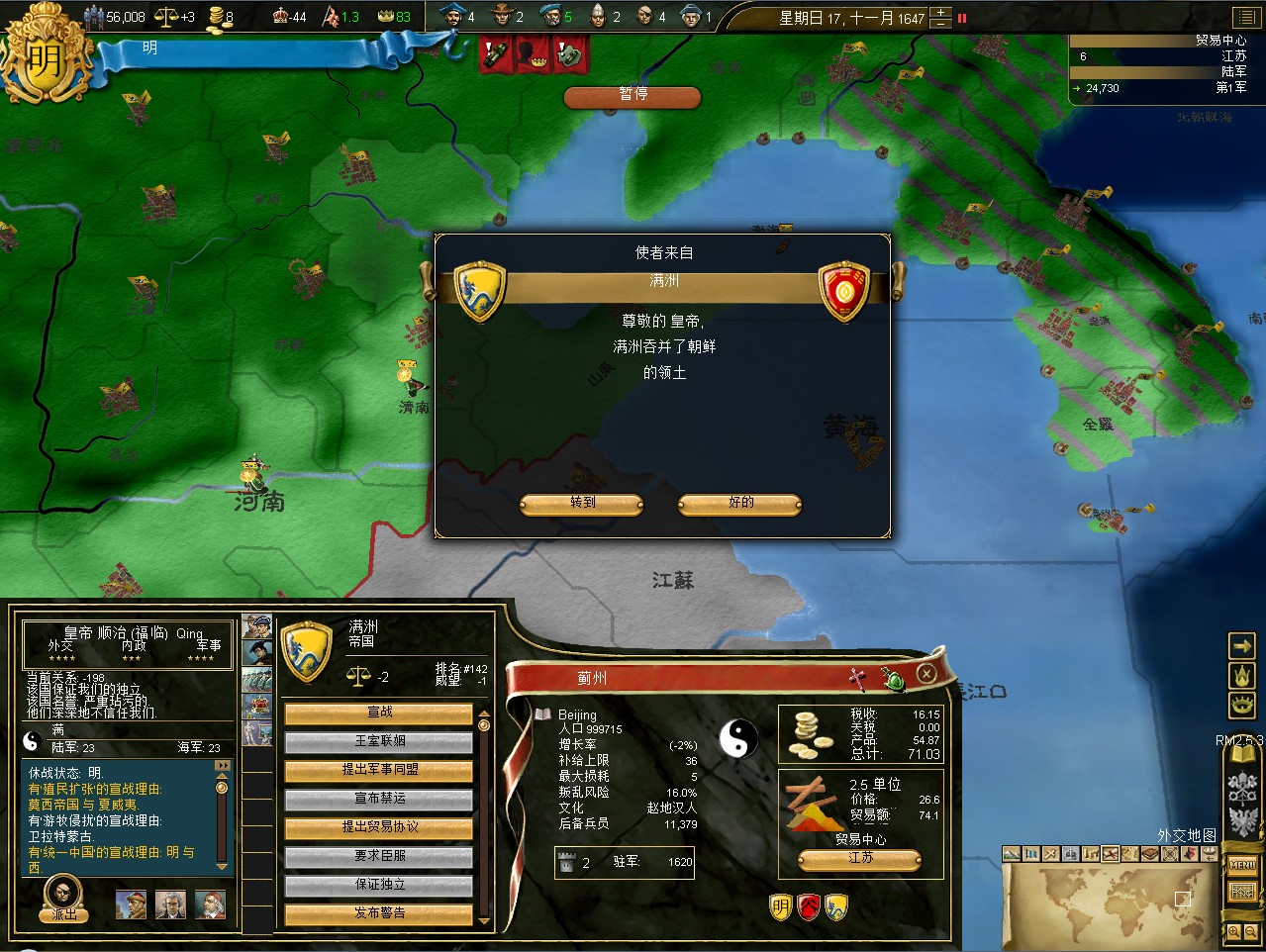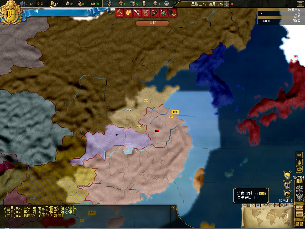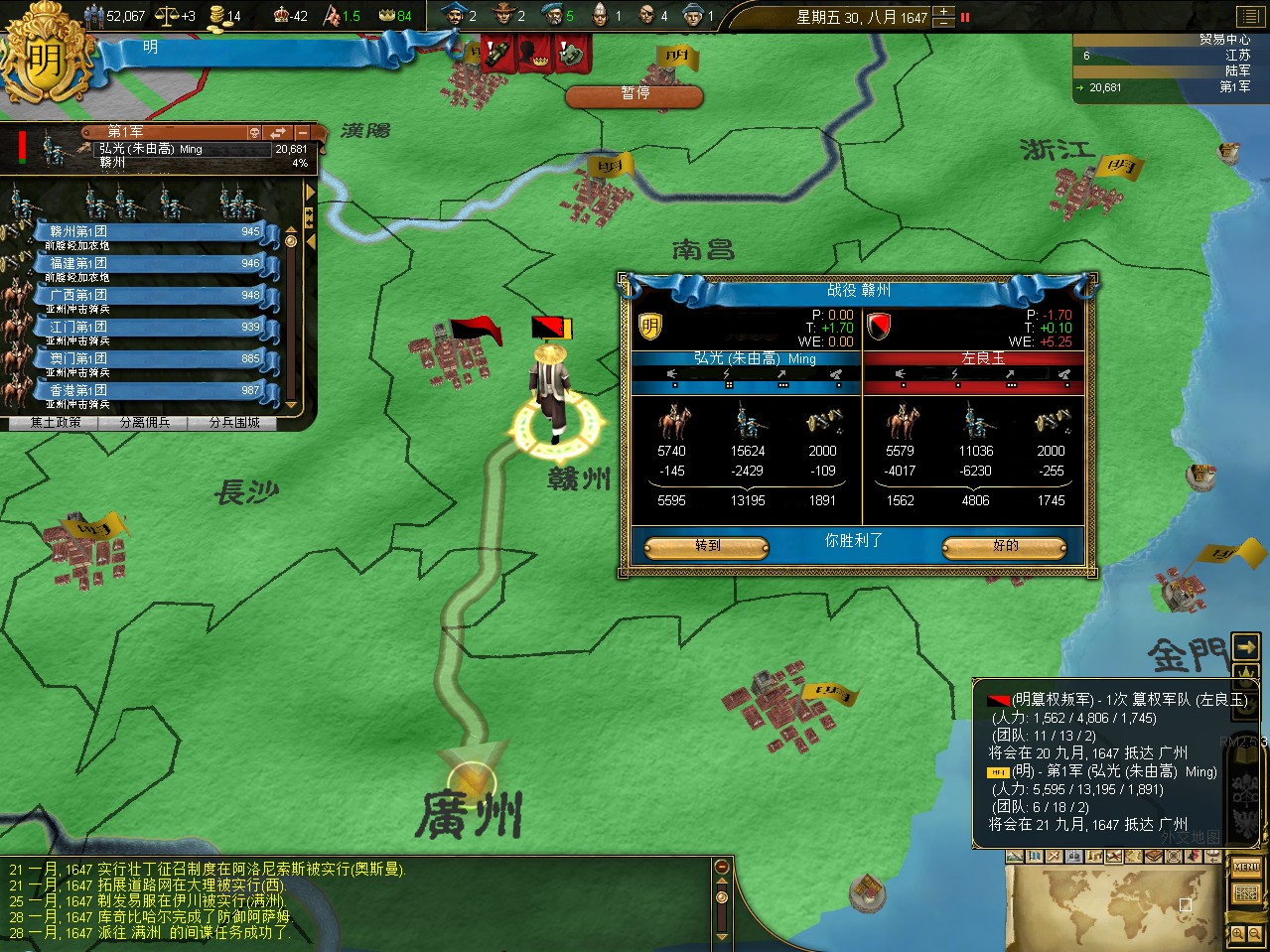 常例开局。话说三个南明剧本 1645 1652 1659,都相当BT。尤其是1659剧本,基本是不可能的任务嘛。1645剧本和1652剧本比较,1652剧本把张献忠的地吞了,兵略多些,还有个BT的李定国,但是1652剧本的南明有两个致命的弱点。一是东面被建奴占了一大片领土,这让我军无法迅速的以最小的代价来与建奴议和。二是江苏丢了,没有了江苏,经济上此消彼长,相当头痛。