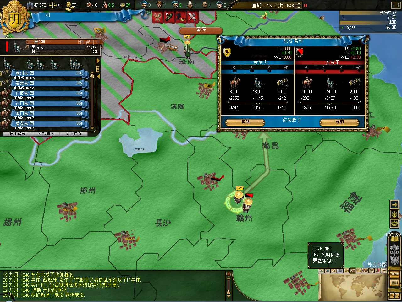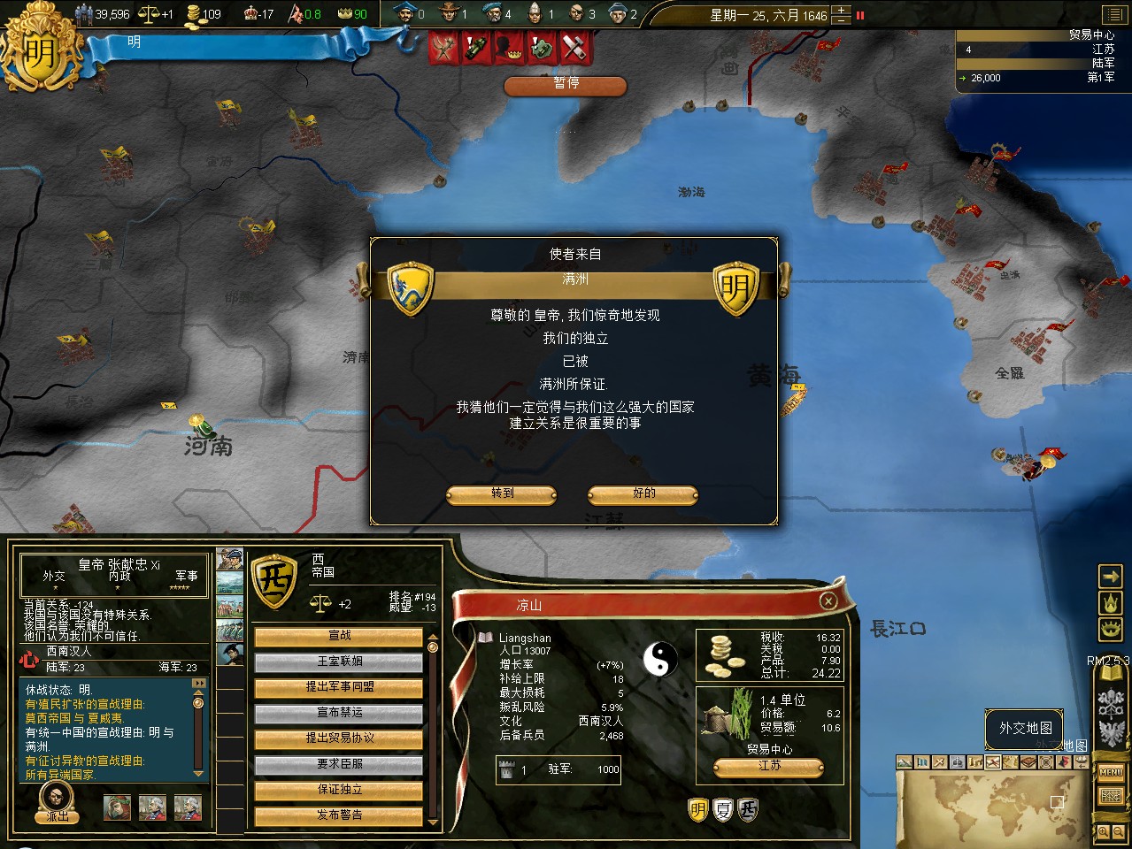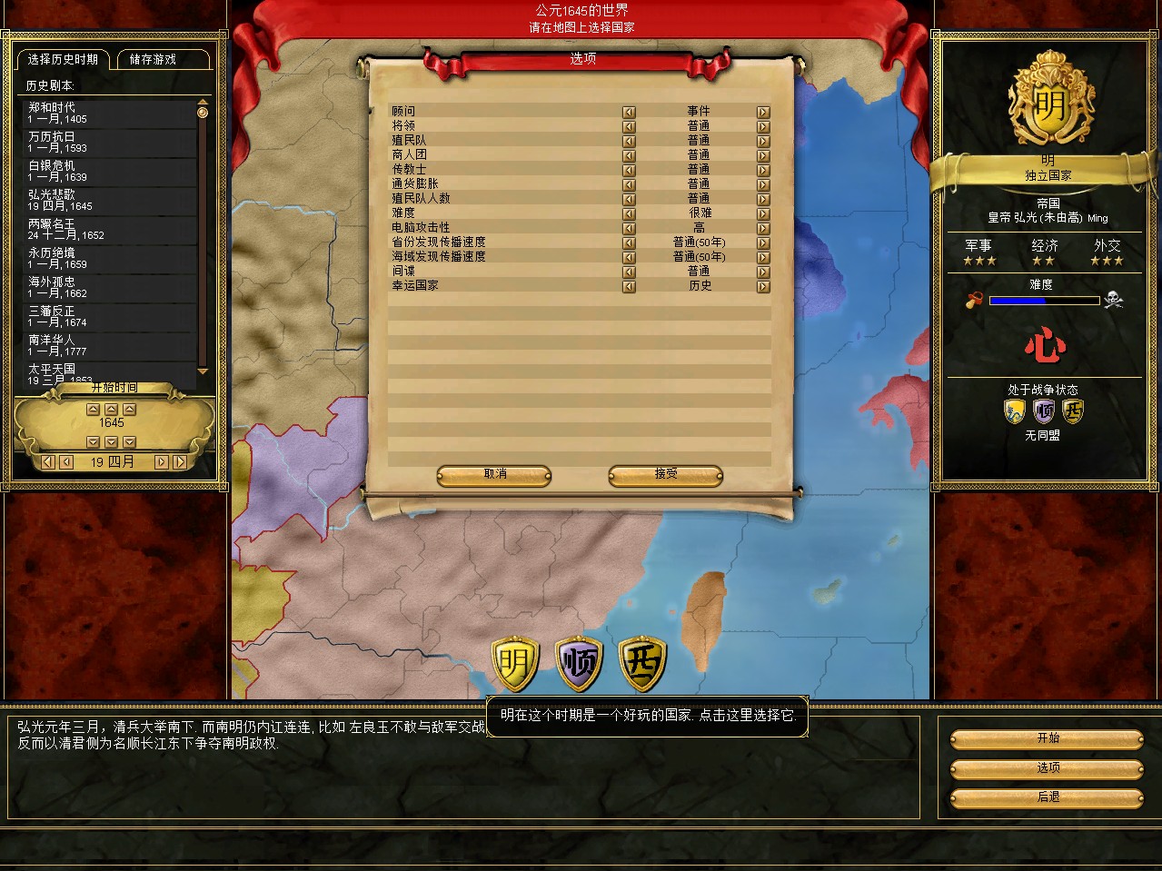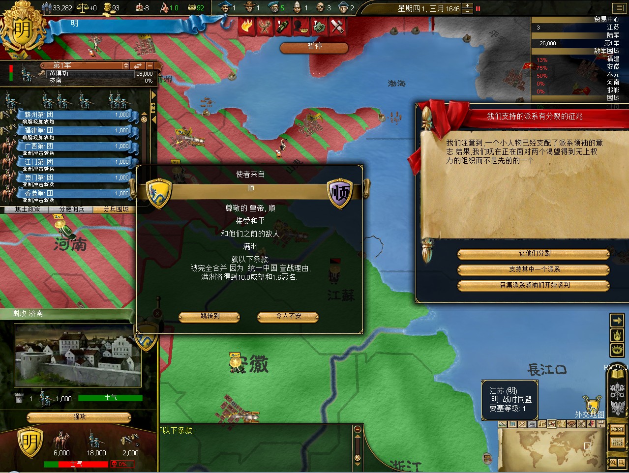 常例开局。话说三个南明剧本 1645 1652 1659,都相当BT。尤其是1659剧本,基本是不可能的任务嘛。1645剧本和1652剧本比较,1652剧本把张献忠的地吞了,兵略多些,还有个BT的李定国,但是1652剧本的南明有两个致命的弱点。一是东面被建奴占了一大片领土,这让我军无法迅速的以最小的代价来与建奴议和。二是江苏丢了,没有了江苏,经济上此消彼长,相当头痛。