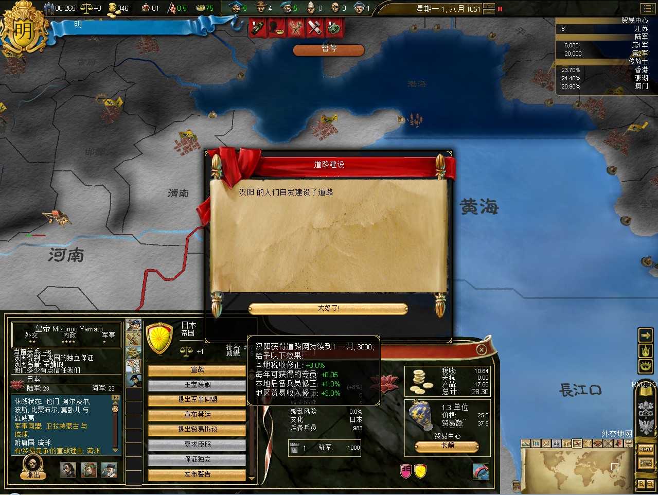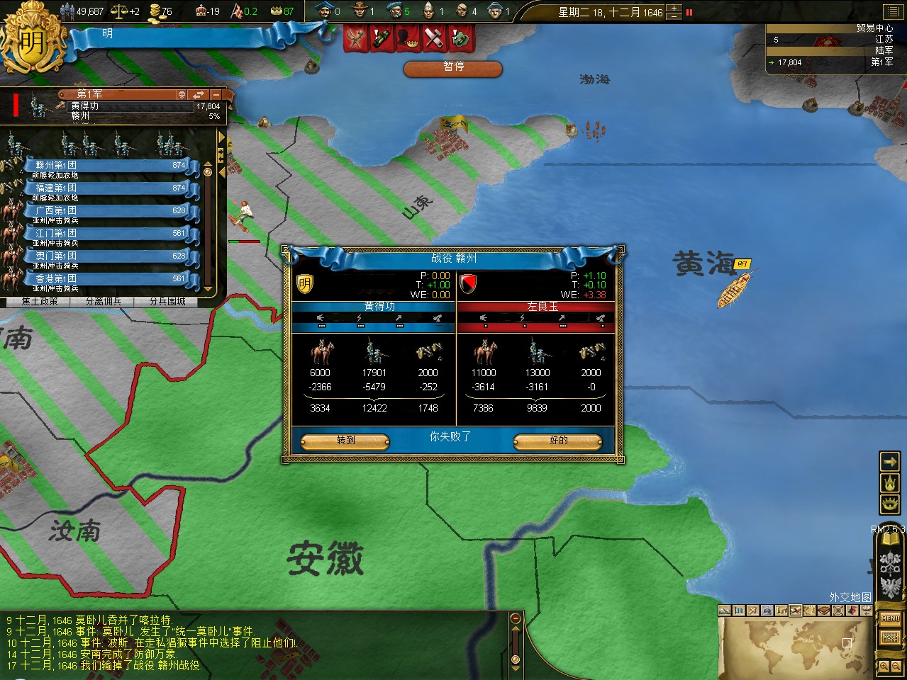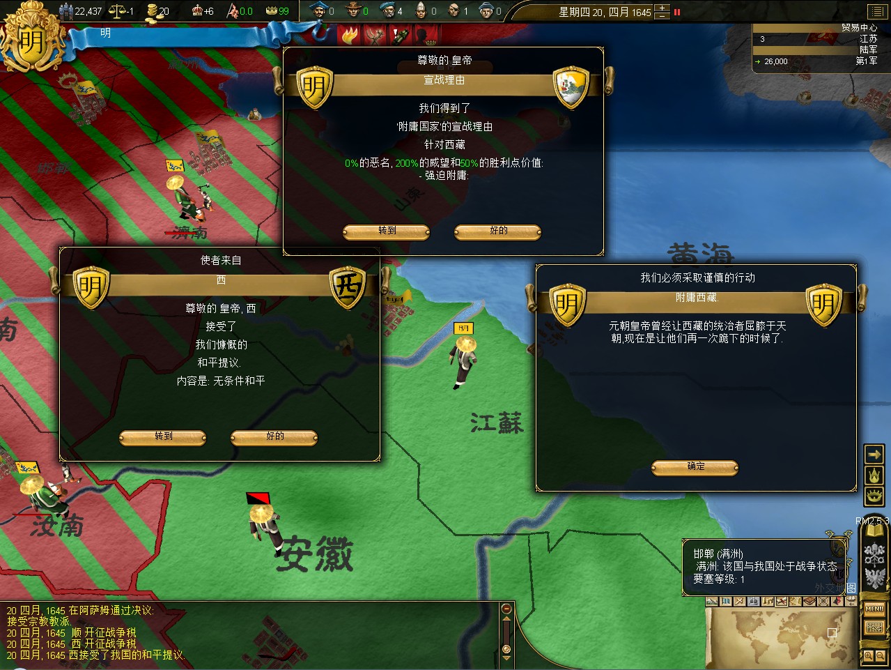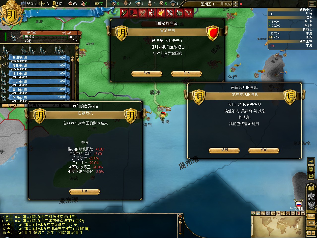 常例开局。话说三个南明剧本 1645 1652 1659,都相当BT。尤其是1659剧本,基本是不可能的任务嘛。1645剧本和1652剧本比较,1652剧本把张献忠的地吞了,兵略多些,还有个BT的李定国,但是1652剧本的南明有两个致命的弱点。一是东面被建奴占了一大片领土,这让我军无法迅速的以最小的代价来与建奴议和。二是江苏丢了,没有了江苏,经济上此消彼长,相当头痛。
