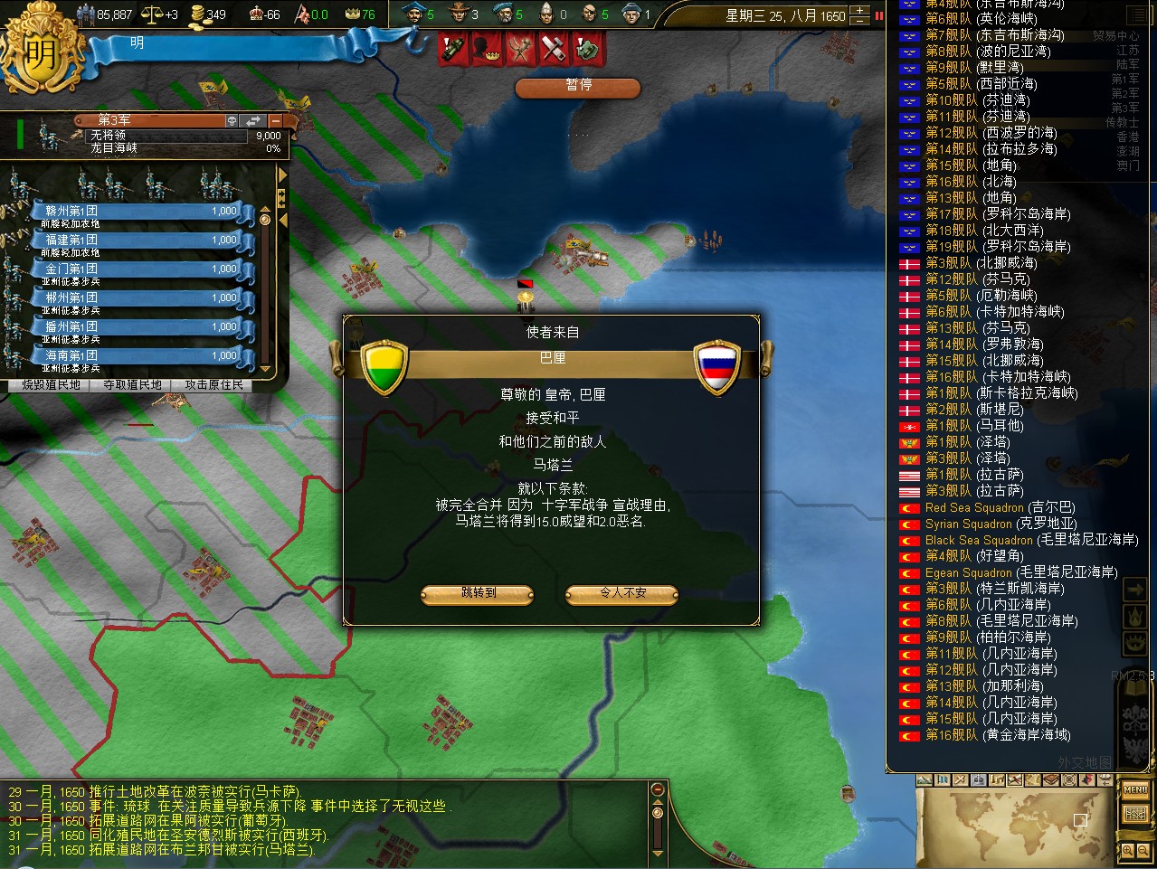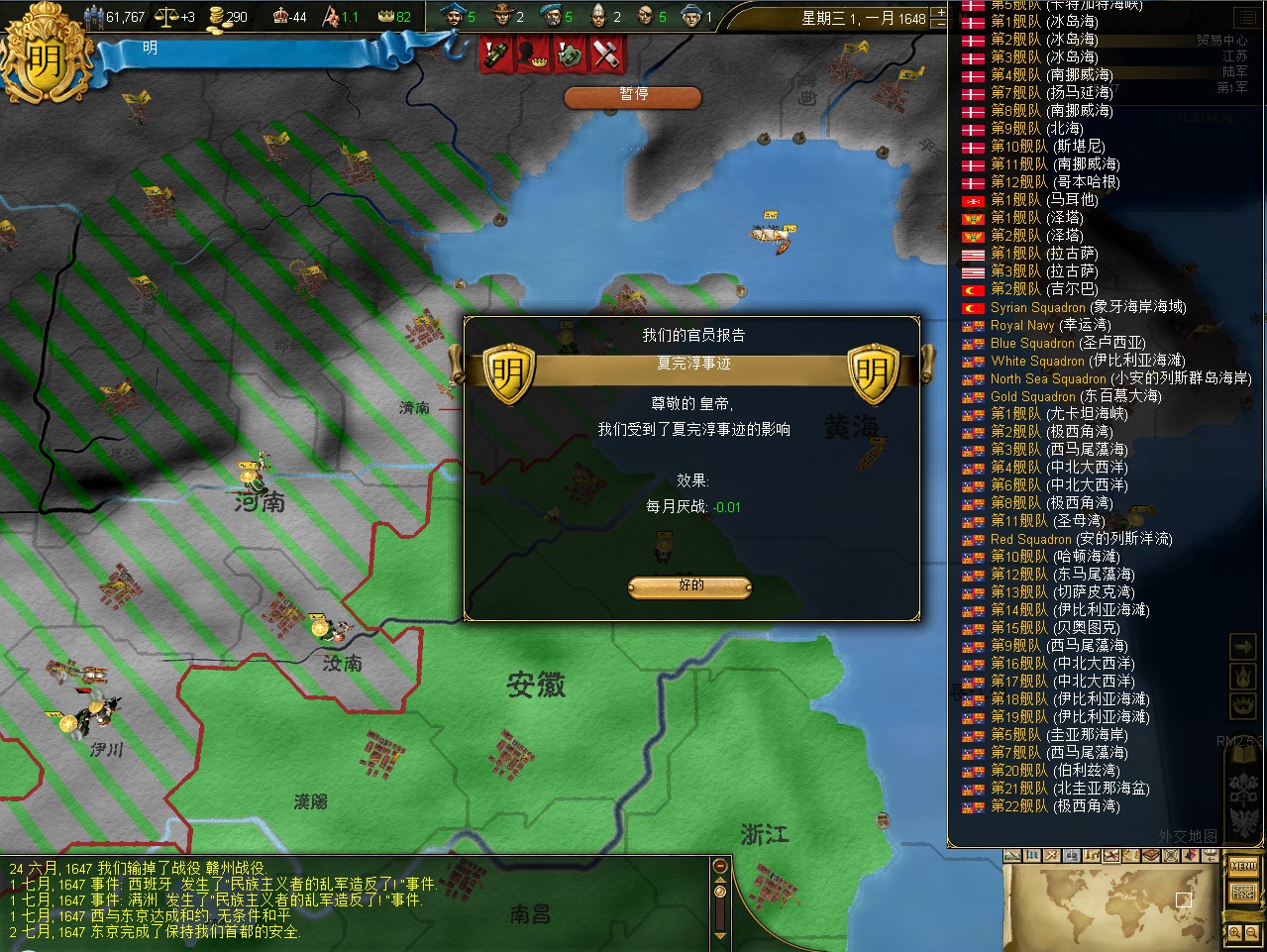 汇报进度。明代中国全境收复,建奴全灭,逆推尼德兰。现有领土:明代中国,满洲,朝鲜(对马(日占),郁陵(朝占)除外),越北,尼德兰旧领2处(包括一个贸易中心),夏威夷,非洲与南太平洋殖民地数块。时间1720年。明日补战报。
