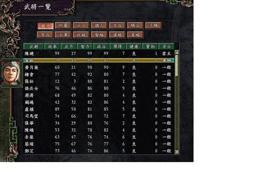 初始人物:共3人 君主,我,统帅智力政治99,武力27,什么技能都不会.